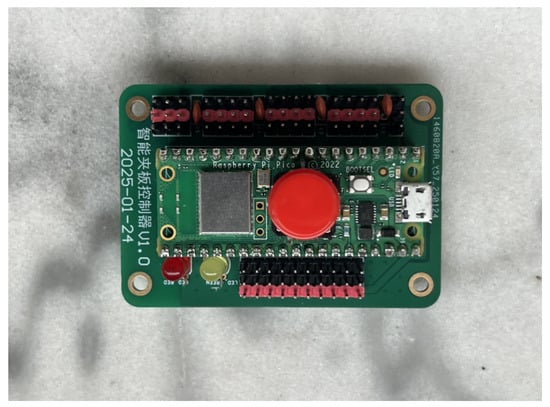 A force sensor is positioned at the linear driver’s fixed end to quantify the rope’s tension. The external fixation device features a waterproof battery compartment and designated space for a PCB control board (Figure 7), which supplies power to the driver and transmits signals for clamping force adjustments. The system is designed with a multi-level fail-safe architecture to ensure patient safety. The primary safety feature is a one-touch emergency power-off button (Figure 8), which is conveniently located on the exterior of the splint for easy one-handed operation by the patient. Critically, the linear motors are custom-designed with a fail-safe mechanism: upon any loss of power, the motor shafts immediately and rapidly retract to their maximum extension, ensuring a complete and instantaneous release of all tensioning force. This, combined with the flexible nature of all connecting materials, ensures the patient’s limb can be freed in any emergency. Furthermore, the control algorithm includes software-based safety protocols. The system continuously monitors sensor data for anomalies (e.g., readings outside a plausible physiological range); if a sensor malfunction is detected, automatic adjustments are immediately halted, and an audiovisual alert is triggered. To prevent servo jamming or incorrect pressure adjustments, the software enforces a hard-coded pressure safety limit, rejecting any control command that would result in a pressure value outside of this predefined safe therapeutic window.