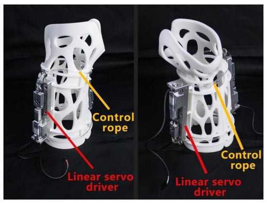 A photograph of the complete smart splint system is shown in Figure 5. The pressure automatic adjustment system employs a 3D-printed nylon external fixation device to stabilize the affected limb. The device features hook-like structures along its edges and is initially secured with a rope lock arranged in a figure-eight configuration. A linear servo driver is positioned on the dorsal aspect of the external fixation device (refer to Figure 6). The ends of the rope are linked to the push rod of the linear servo driver through a pulley or sheave mechanism. The extension or retraction of the linear driver’s push rod results in the tightening or loosening of the rope, thereby adjusting the clamping force of the external fixation device. Cable mechanisms are installed at the device’s proximal palm and proximal finger ends to regulate the tightening force at both locations.