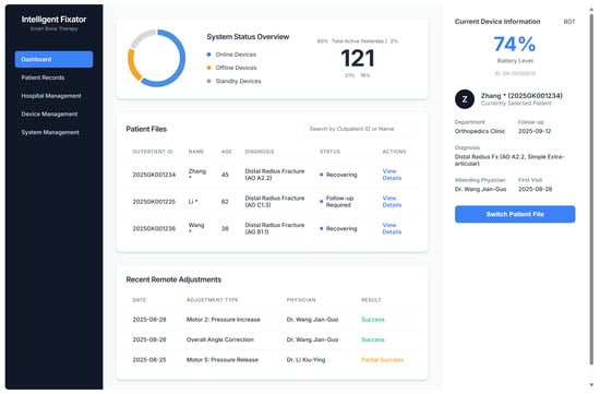 The user interface of the physician-facing “Intelligent Fixator” management dashboard, showcasing the system status overview, patient files, and recent remote adjustment logs.