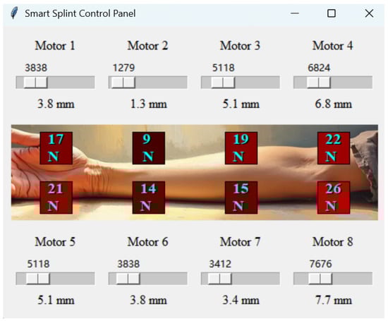 The user interface of the “Smart Splint Control Panel”. The central panel visualizes real-time pressure data (in N) from the eight sensors, while the upper and lower panels display the control status for each of the eight servo motors, including their current displacement (in mm).