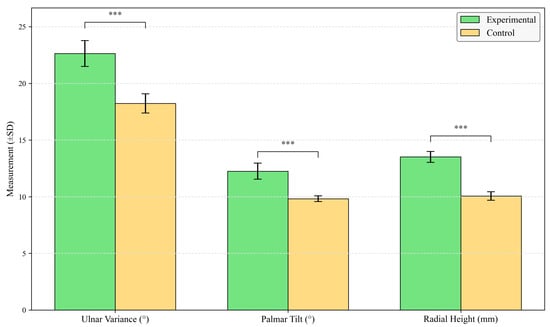 Comparison of fracture healing outcomes. The experimental group showed significantly better results in Ulnar Variance, Palmar Tilt, and Radial Height. *** denotes .