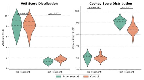 Comparison of VAS and Cooney scores. Violin plots showing the distribution of VAS scores and Cooney scores for both groups before and after treatment. Post-treatment scores show significant improvement in the experimental group compared to the control group ().
