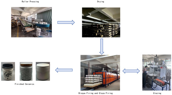 The daily-use ceramic production flow typically consists of five sequential stages: roller pressing, drying, Bisque firing, glazing, and glaze firing. These stages are visually illustrated in Figure 1. The process exhibits three critical characteristics that greatly increase scheduling complexity: (1) each stage is equipped with multiple parallel machines, enabling batch-level parallelism; (2) customer orders usually involve large quantities of standardized items, necessitating synchronized batch scheduling across all stages; and (3) the firing stages, Bisque and glaze firing, utilize shared kilns that require lengthy preheating cycles, imposing a no-idle constraint to preserve thermal efficiency and reduce energy consumption. These constraints not only reflect physical system limitations but also serve as virtual indicators of resource availability and urgency within the production schedule. Therefore, modeling these interactions accurately is essential to enable intelligent, data-driven scheduling within a smart factory framework.