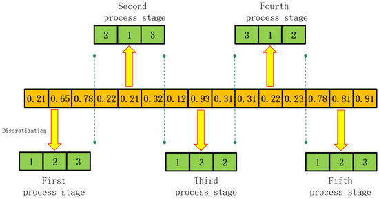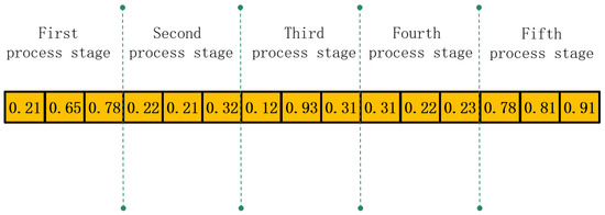A simplified example of this segmented encoding mechanism is illustrated in Figure 3, which demonstrates a three-sub-batch case. For the first processing stage, the algorithm assigns real-valued priorities (e.g., 0.21, 0.65, etc.) that dictate execution order. This process is repeated independently for each of the five stages, forming a modular structure where each segment acts as a self-contained scheduling agent. This modularity mirrors the logic of distributed control in smart manufacturing environments, where decisions are made per station or equipment unit based on local load and processing rules.