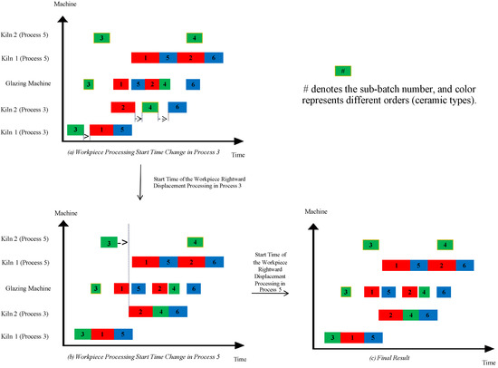 Figure 4 illustrates the complete decoding pipeline. First, each continuous vector is mapped to a discrete priority list through rank-based transformation. These ranked indices determine the processing sequence for sub-batches at each respective stage. Next, an insertion-based allocation heuristic is applied to assign jobs to machines, dynamically considering machine availability, stage-specific constraints (e.g., no-idle operations for kilns), and the global sequencing structure derived from the encoded solution.
