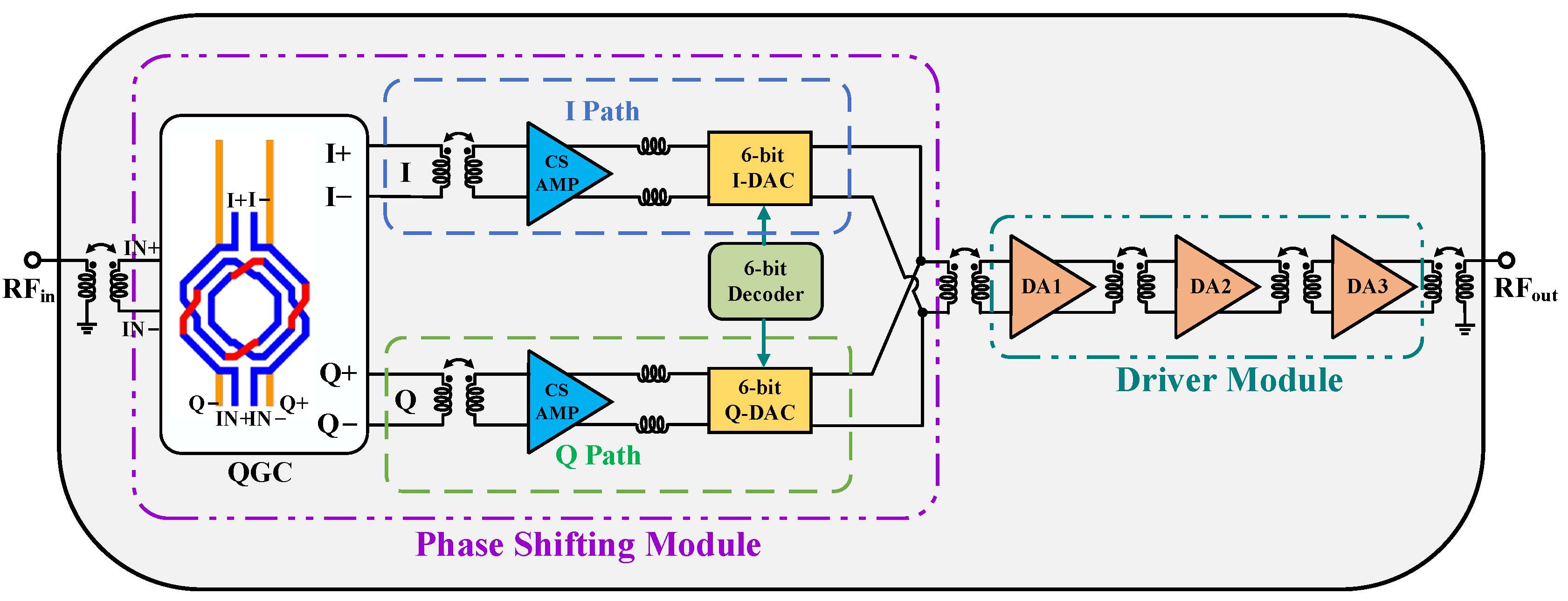 - Wu, T.; Zhao, C.; Liu, H.; Wu, Y.; Yu, Y.; Kang, K. A 51.5–64.5 GHz Active Phase Shifter Using Linear Phase Control Technique with 1.4° Phase resolution in 65-nm CMOS. In Proceedings of the 2019 IEEE Radio Frequency Integrated Circuits Symposium (RFIC), Boston, MA, USA, 2–4 June 2019; pp. 59–62. [Google Scholar] [CrossRef]