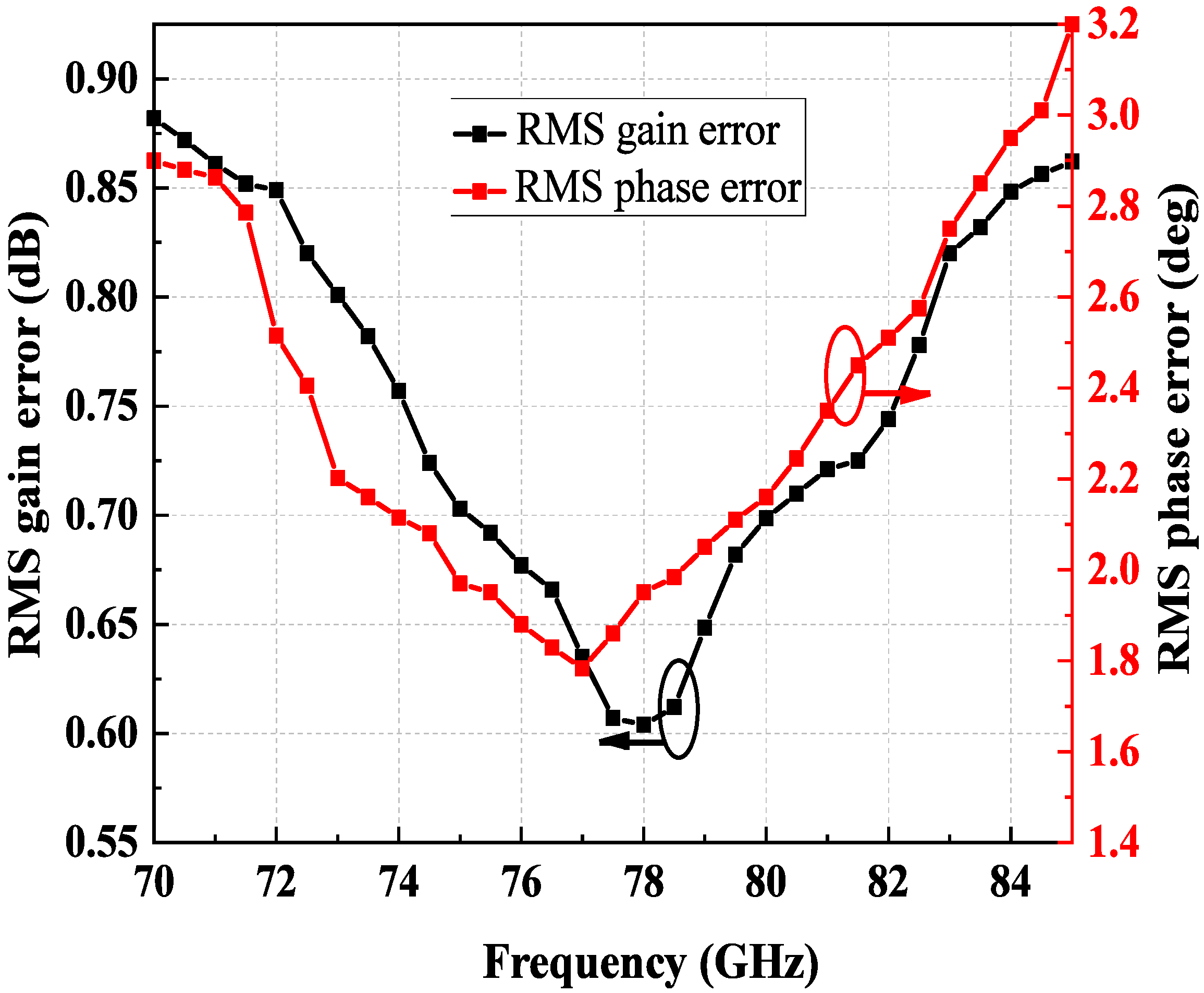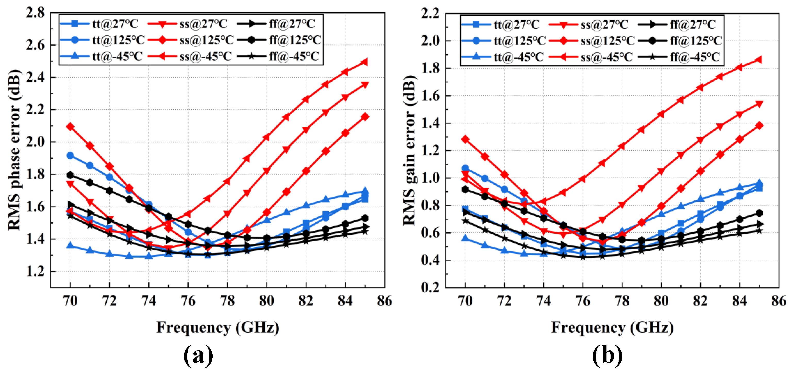 | Refs | CMOS Process | Frequency (GHz) | Resolution (bits) | RMS Phase Error (deg) | RMS Gain Error (dB) | Peak Gain (dB) | DC Power (mW) | Core Area (mm2) | FoM (dB) |