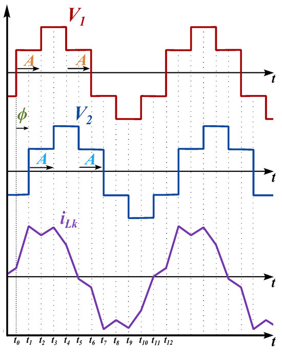 The MAB converter shown in Figure 1 consists of two symmetrical MPC topologies at the input and output. Each one enables the same number of voltage levels and produces similar waveform shapes on its respective sides. These configurations provide diverse injection of power from different inputs. The high-frequency transformer (HFT) has turn ratio , magnetizing inductance , and leakage inductance . In steady-state operation, the MAB-based converter can be modeled as two high-frequency AC sources connected across an inductor, where represents the sum of the series and leakage inductances of the transformer, and are the HFL voltages of the bridges, and is the corresponding HFL current. Figure 2 shows the key operating parameters, with and representing the transformer’s input and output voltages and denoting the leakage inductance current. The phase shift controls energy transfer by defining the angular displacement between the waveforms. The modulation index A determines the fraction of the switching cycle in which power transfer occurs and is the same for both and in the given switching pattern. The converter’s various operating states are identified based on its switching pattern. These states are classified using two key parameters: the phase shift between and , which is , and the modulation index A.