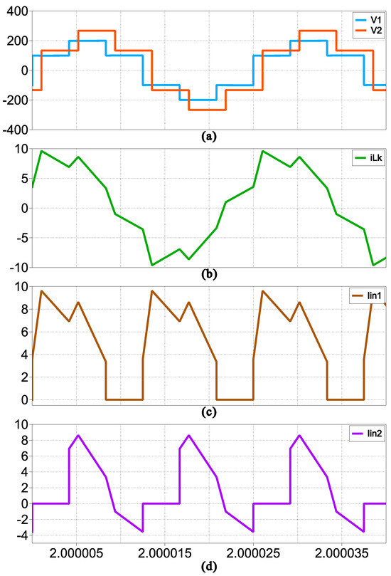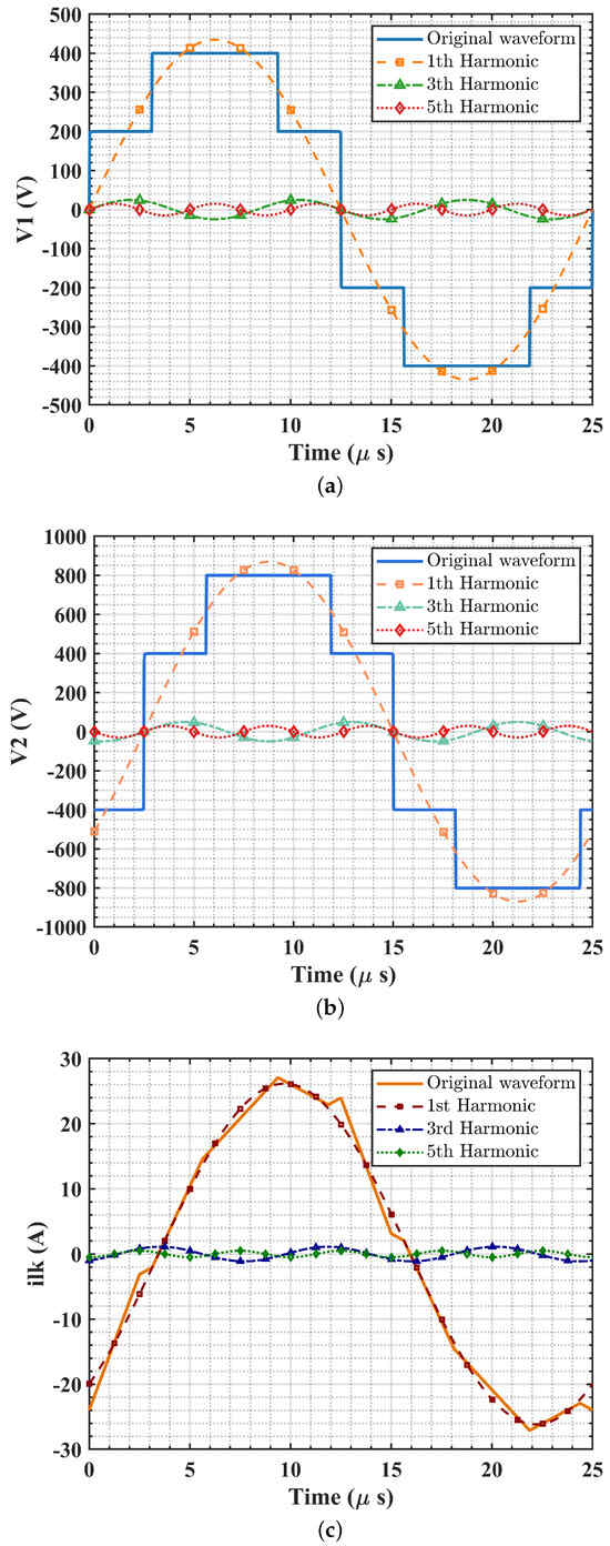 Based on the previous analysis, Figure 3 shows the curves of HFL electrical components for a given modulation index A. The results show that the HFL voltages and , together with the leakage inductance current , consist of odd-frequency components only, with overall waveforms consistent with those derived from the conventional piecewise linear method [9].