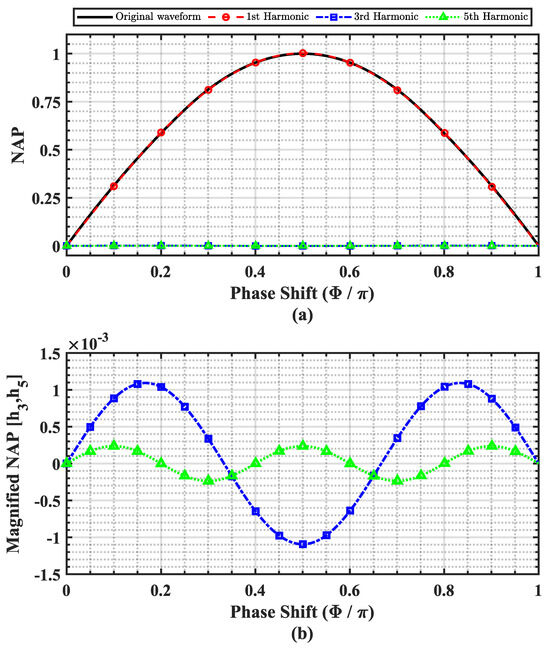 Normalized active power over one period: (a) NAP variation with phase shift, showing fundamental and harmonic components, (b) magnified view of the 3rd and 5th harmonics.