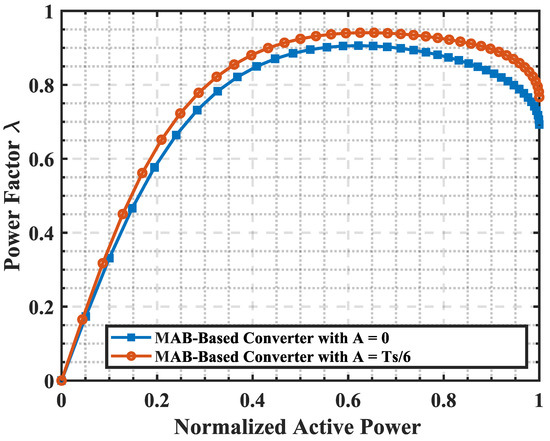 Comparison of power factor for conventional QAB and MAB converters over normalized active power.