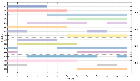 The MAB uses 16 switching signals for the 16 power switches, as shown in Figure 6. Each switch operates at specific instants in a sequence labeled from to . Using the waveform diagram in Figure 6, the instantaneous current for each switch is derived. The following equations demonstrate current profiles using a piecewise linear ramp approximation. From Figure 6, the instantaneous values of the currents of all switches are derived here.