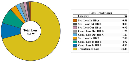 Furthermore, the chart in Figure 7 complements the data in Table 4 by providing a visual representation of the power loss distribution, enabling easier identification of components with significant losses. This visualization highlights areas where improvements, such as minimizing conduction paths, could lead to further efficiency gains. Simulations were conducted in MATLAB R2024a/PLECS Blockset 4.9.5 using actual switching patterns. Figure 6 displays the donut chart illustrating the power loss breakdown. The highest losses are attributed to conduction losses in input-side HB1 and HB2, followed by moderate losses at the output. Switching losses remain relatively low.
