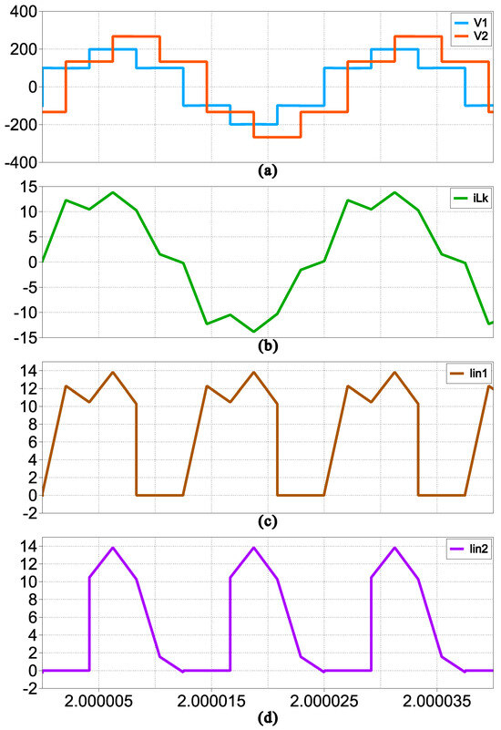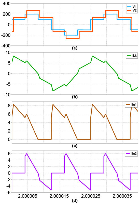 In Figure 8a, the phase shift is defined as . The voltage waveform , which represents the primary side voltage of the transformer, reaches a maximum of 200 V, as it is the sum of the two input supply voltages. The secondary side voltage , mirrored onto the input side, reaches a peak value of 266.66 V. The leakage inductance current is also shown in Figure 8b, with an RMS value of 4.95 A. In addition, the input currents and are shown in Figure 8c,d. It is observed that exhibits a significant negative current with a peak amplitude of −5.25 A. This large circulating current at small phase shifts leads to a reduced power factor and consequently lower power transfer efficiency, as reflected in Figure 5. To analyze the system behavior at a higher phase shift, Figure 9 presents the simulation results for . The voltage waveforms and remain unchanged compared to the previous case, as shown in Figure 9a. However, the RMS value of the leakage inductance current increases to 6.11 A, as shown in Figure 9b. The input currents and are also shown in Figure 9c,d. Notably, despite the increase in , the peak negative current in is reduced to −3.57 A. This reduction in negative current indicates an improvement in the power factor, as the extent of circulating power is minimized. Figure 10 shows the simulation results for the phase shift corresponding to the highest power factor efficiency, identified as . The RMS value of increases further to 9.29 A due to the higher phase shift. As shown in Figure 10b, the mean value of increases compared to the previous cases and ). More importantly, the amplitude of the negative current in is significantly reduced to −0.18 A, indicating minimal circulating current. This reduction directly translates into a higher power factor and improved power transfer efficiency in the MAB-based multilevel topology. These results confirm that increasing the phase shift effectively improves the power factor performance by minimizing the circulating currents, leading to improved efficiency in the proposed converter.