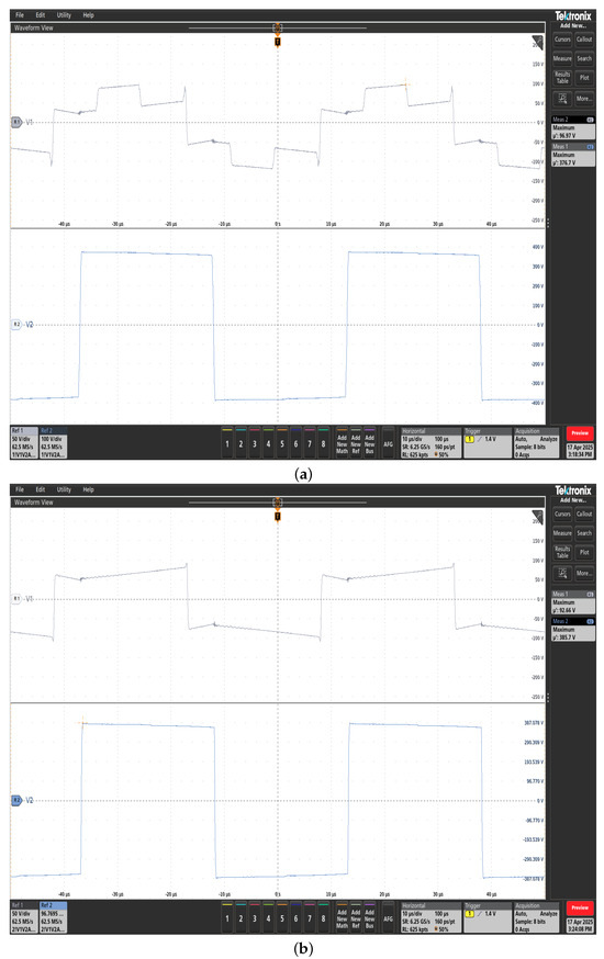 To examine the effect of the MAB-based multilevel converter, the system was tested under two different modulation indices and , while maintaining a constant power transfer of 500 W and a fixed phase shift of in both scenarios. Figure 11a,b present the primary and secondary voltage waveforms across the transformer. In Figure 11a, with , the primary voltage of the transformer reaches a peak of 96.97 V, resulting from the combined output of the two H bridges. The secondary voltage peaks at 376.7 V. When the modulation index is zero [Figure 11b], drops slightly to 92.66 V, while increases to 385.7 V. Figure 12a,b show the upper H-bridge current waveforms. With , the leakage inductor current exhibits an RMS value of 18.64 A, and the minimum input current is −17.20 A [Figure 12a].