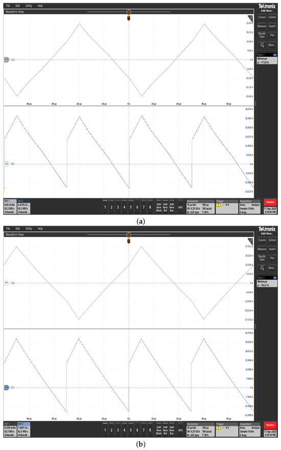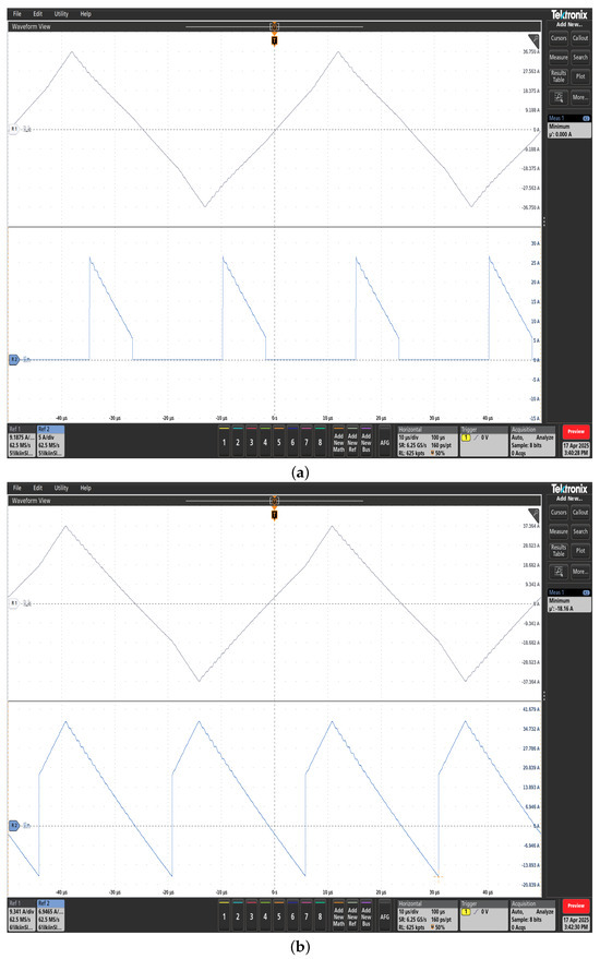 When , these values increase to 20.46 A and −18.27 A [Figure 12b] respectively, indicating that the inclusion of the intermediate voltage level reduces negative current injection by 1.07 A. Figure 13a,b show similar trends for the lower H bridge. In Figure 13a with , the minimum input current is fully eliminated, while with , it reaches −18.16 A [Figure 13b]. The RMS values follow the same increase as in the upper H-bridge case. These results confirm that the proposed multilevel modulation strategy significantly reduces the circulating current and minimizes the input current distortion, contributing to improved efficiency and performance of the MAB-based system.