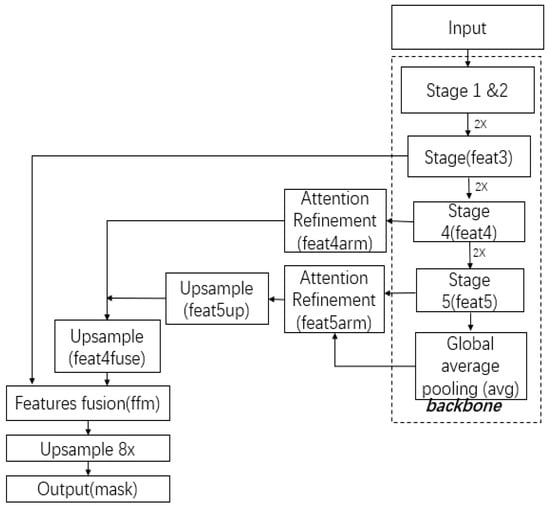 The network then implements a cascaded feature integration strategy, where the global context vector “avg” is combined with the attended high-level features (feat5arm) and upsampled 2× to produce feat5up. This intermediate representation is fused with the attended mid-level features (feat4arm) through element-wise summation, yielding the composite feature feat4fuse. The architecture further integrates lower-level details by combining feat4fuse with the stage three features (feat3) through a dedicated feature fusion module (FFM), which employs both spatial and channel attention to optimally combine multi-scale information. The resultant fused feature map (ffm) undergoes 8× bilinear upsampling to restore original input resolution before final pixel-wise classification. This carefully designed feature hierarchy and fusion strategy enables the STDC network to maintain segmentation precision while operating at real-time speeds.