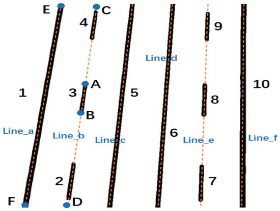 Conceptual diagram of lane segmentation elements. Numbers 1–10 correspond to distinct line segments in the semantic segmentation results, letters A–F represent independent points, and labels Line_a to Line_f denote different lane markings.