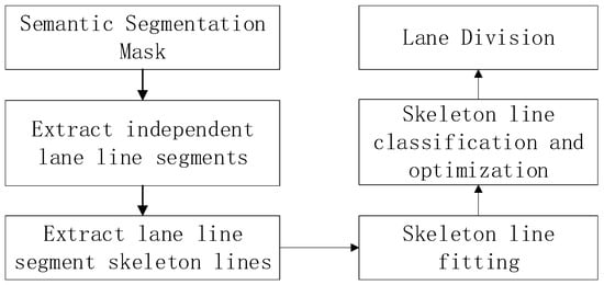 The overall workflow of our proposed algorithm is illustrated in Figure 4. The input semantic segmentation mask, produced by the STDC network (Figure 1), is subjected to connectivity analysis to isolate distinct lane segments and extract their skeletal structures. These resulting skeletons are then approximated using polynomial fitting. Based on the positional relationships between these skeleton lines, we classify them into co-linear groups and ultimately divide the road into distinct lane regions.