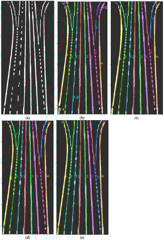 Illustrative example of lane marking initial fitting process, where the colored curves in Figures (b–e) represent the fitted lane markings, and their corresponding number labels are shown in the same color. (a) Lane marking segmentation mask, where white regions represent lane segments and black denotes background; (b) Initial fitting results of lane markings, with distinct colors indicating different fitted lane curves; (c) Merged lane marking representation after topological combination; (d) Refined boundary representation following edge re-fitting; (e) Final complete lane topology after closure operation.