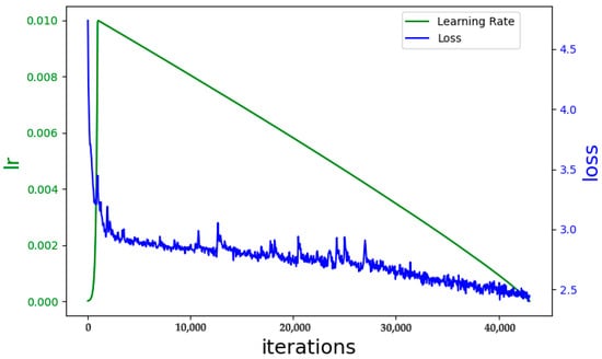 Learning rate and loss function curves, where the blue line represents the loss value, the green line indicates the learning rate, and the x-axis denotes the number of training iterations.