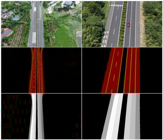 Currently, research pertaining to lane detection and segmentation predominantly centers on autonomous driving applications, wherein image data are typically acquired from a ground-level, horizontal perspective [17,18,19,20,21]. In contrast, studies addressing lane feature extraction from unmanned aerial vehicle (UAV) viewpoints remain considerably limited [22,23]. The aerial perspective introduces several fundamental differences: UAV imaging captures comprehensive lane topologies including complex configurations (merges, diverges, and interchanges) across the entire roadway width, whereas ground-level systems typically observe only immediate adjacent lanes with relatively linear geometries. Furthermore, the operational focus of terrestrial systems on immediate navigation needs creates significant methodological incompatibilities for aerial data processing. These differences manifest as unique technical challenges including increased lane pattern variability, perspective-induced geometric distortions, and illumination artifacts characteristic of aerial acquisition—all demanding specialized algorithmic solutions.