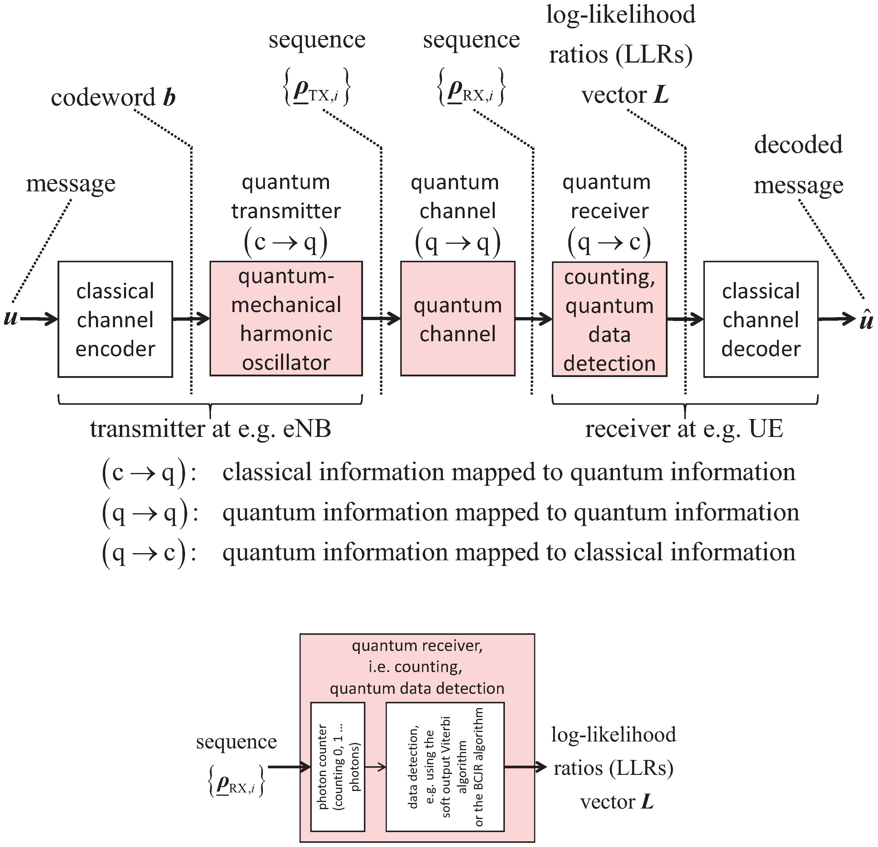 The basic block diagram of the resulting physical layer transmission, originating at a single transmitter located e.g., at a base station, usually called eNB, and terminating at a single receiver located consequently at the user equipment (UE), is shown in Figure 1, cf. e.g., ([], Figure 1.30, p. 289). The transmitter consists of the classical channel encoder, which has been common in classical wireless communication systems, cf. e.g., [], and a quantum transmitter, which represents the classical information generated by the classical channel encoder by a sequence quantum states. In this communication, we will focus on sophisticated channel coding based on polar codes, cf. e.g., ([], Chapter 4, pp. 336–388) for a brief introduction. The quantum transmitter can, for example, be realized by a quantum mechanical harmonic oscillator that provides coherent states, namely a laser ([], pp. 11, 80f.; [], p. 1584; [], pp. 125–128), which will be considered in this communication. The quantum channel, which conveys the information generated by the transmitter to the single receiver, is connected to the output of the quantum transmitter and to the input of the receiver, which consists of a quantum receiver followed by a classical channel decoder. The quantum receiver is supposed to be a soft output quantum data detector that consists of the measurement device, characterized by commuting measurement operators, in our case given by a photon counter, and the soft output generation unit, which uses the measured probability values to create soft outputs in the form of log-likelihood ratios (LLRs), which in our case is a data detector, e.g., based on the soft output Viterbi algorithm, the Bahl–Cocke–Jelinek–Raviv (BCJR) algorithm or the alike. The mode of operation of the wireless quantum optical communication system depicted in Figure 1 will be addressed in Section 2.
