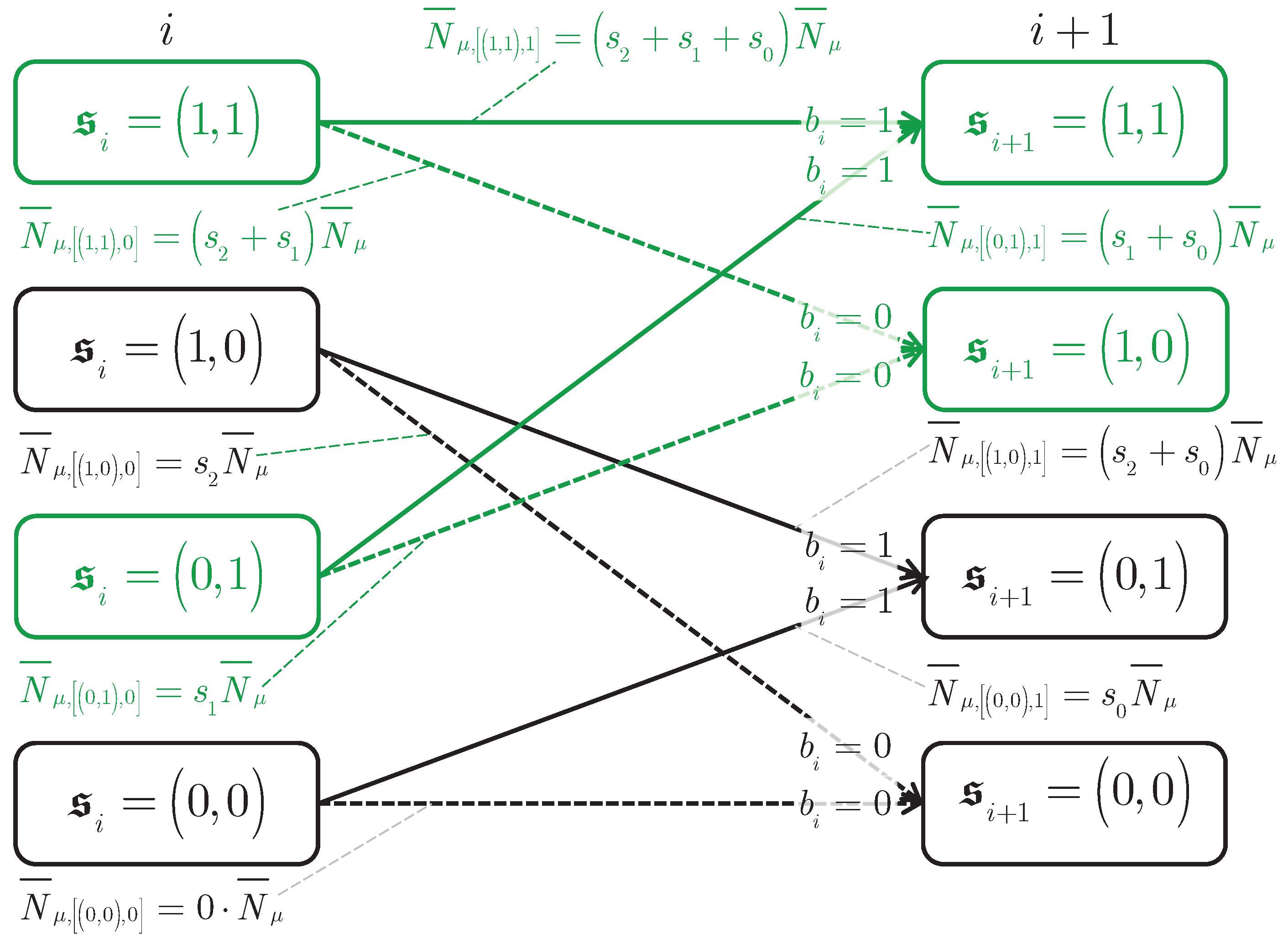 Figure 2 shows the detail of a trellis representing a quantum channel with equal to 3 possibly non-vanishing channel coefficients , and , thus, when applying Mealy modelling, having equal to 4 states at each time instant. The two states equal to and equal to at time instant i are connected to the two states equal to and equal to at time instant by a total of equal to four transitions. The said states and the aforementioned four transitions, all represented in black color, form the first of the two butterflies of the considered trellis. The two states equal to and equal to at time instant i are connected to the two states equal to and equal to at time instant by a total of equal to four transitions. These states and the associated four transitions, all represented in green color, form the second of the two butterflies of the considered trellis.