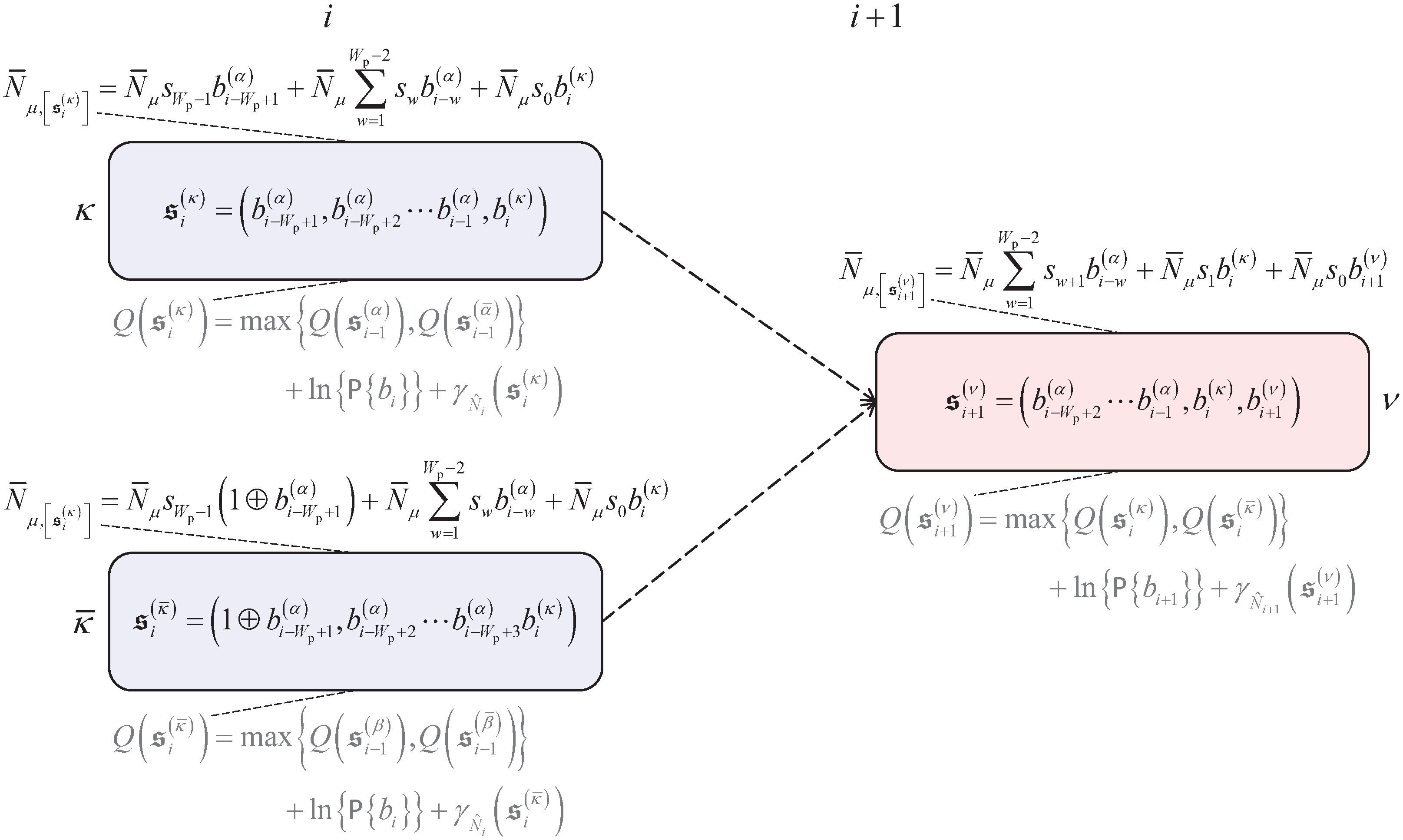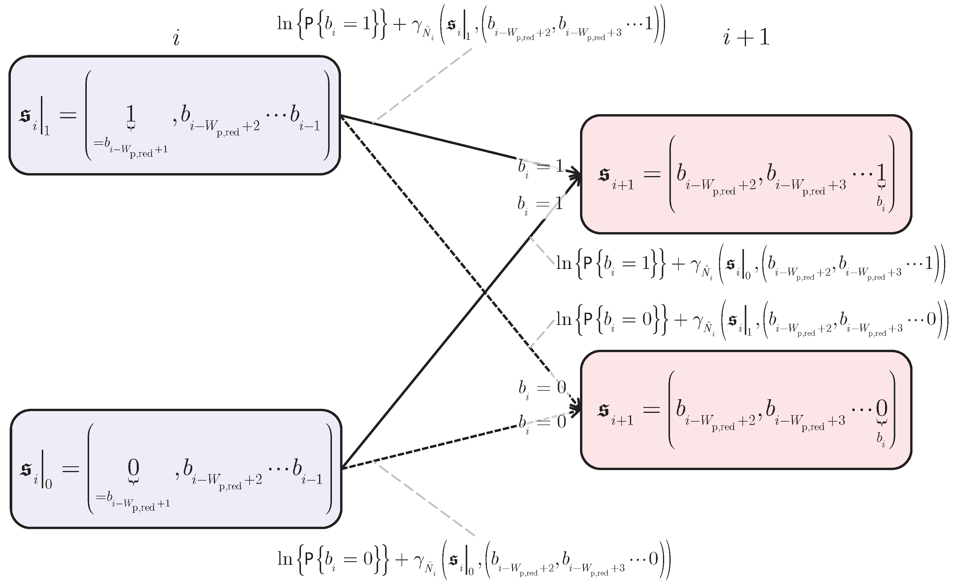 In the context of Mealy modelling, cf. e.g., [], the previously described FSM consists of states , defined as at each time index . Since the term can take on either of two distinct values, 0 or , each of the states gives rise to two transitions, labelled by the hypothetical codebit value . This results in a total of distinct transitions, which lead to the states at the next time step []. The behavior of the said FSM is conveniently represented by a trellis diagram, often abbreviated as trellis [,,]. Accordingly, the possible transitions correspond to the different values that the average number of received signal photons , as defined in (22), can assume during each observation time interval , with . For this reason, we will denote as going forward, identifying these quantities as the distinct hypotheses employed in the quantum data detection scheme []. Note that the said hypotheses do not necessarily match the actual number of received signal photons observed in the ith observation time interval [].