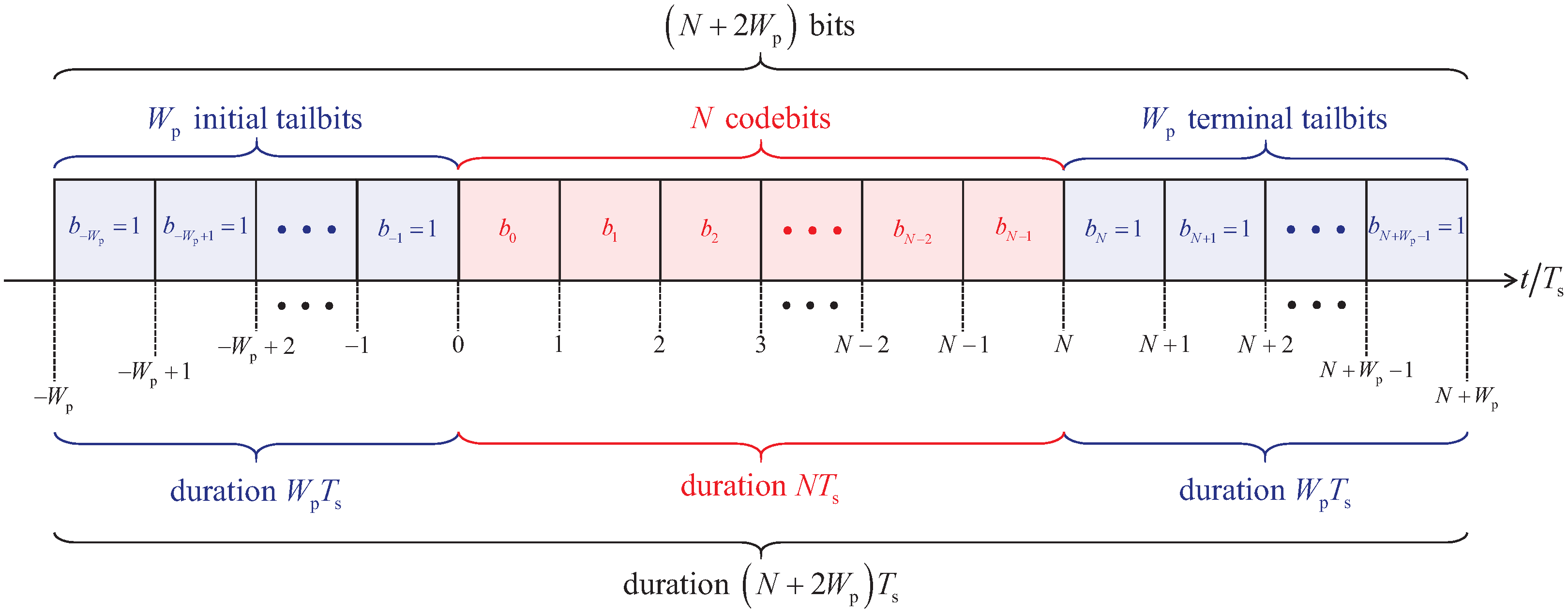 To support trellis initialization in the state equal to and trellis termination in the state equal to , a choice known to improve data detection performance, we introduce initial and terminal tailbits. Specifically, we set equal to 1 for all . All other codebits , for and , are assumed to be 0.