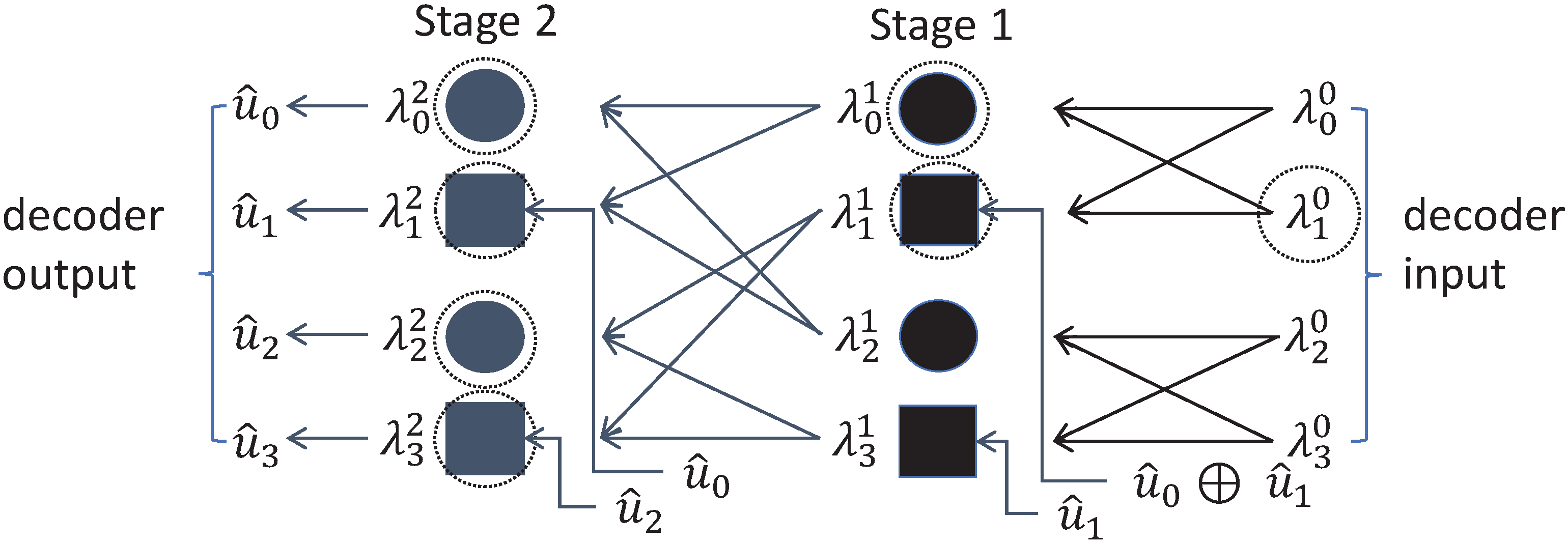 In what follows, complex values are underlined and denotes complex conjugation. Operators, matrices and vectors are in bold face italics. equal to denotes the Galois field with the two elements 0 and 1. equal to is the set of nonnegative integers and equal to denotes the set of positive integers. equal to , , is the set of message bit indices and equal to , , , is the set of codebit indices. We will apply the Dirac notation.