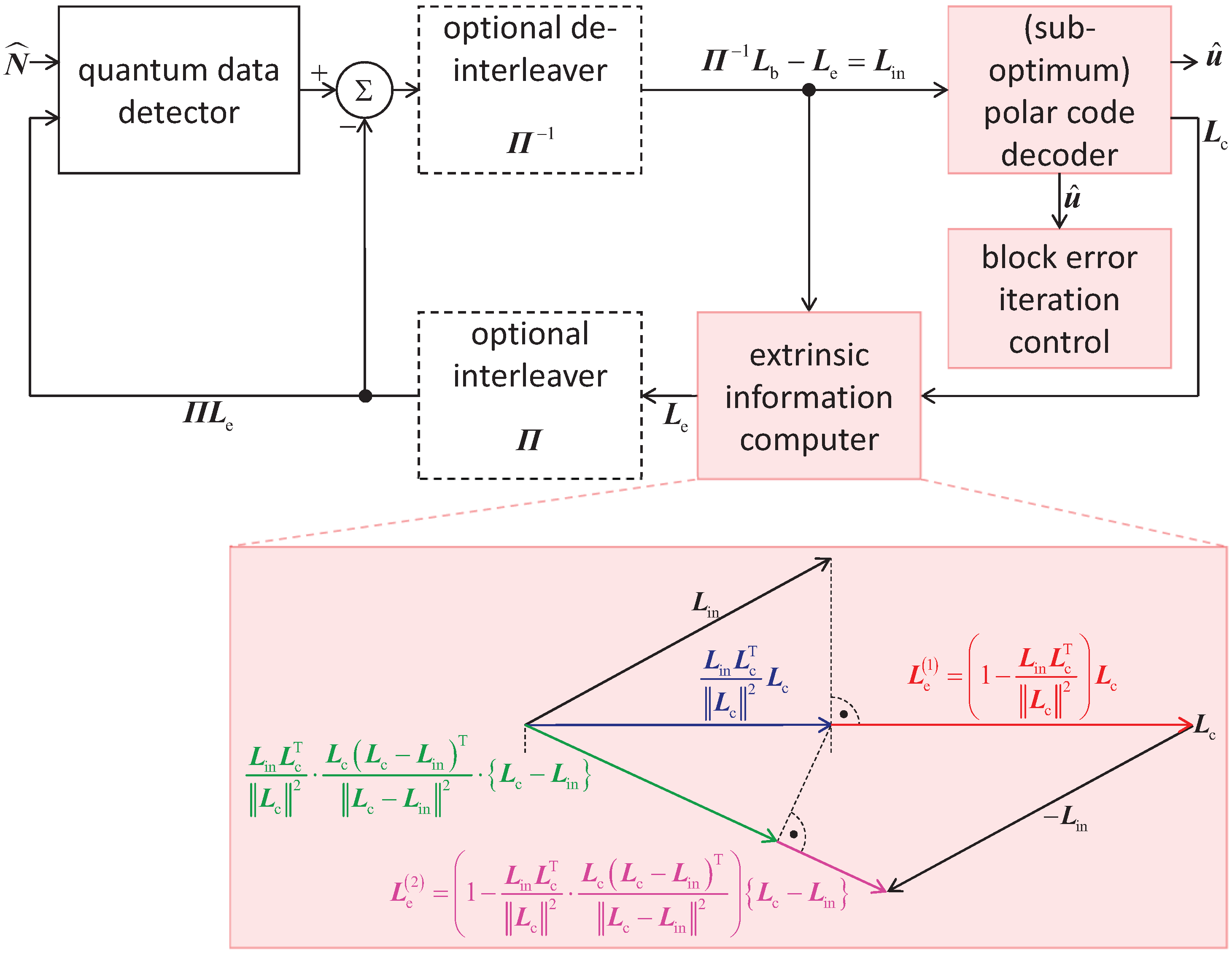 In Section 3 polar coding will be addressed, by briefly illustrating its general concept and also by introducing a detailed design strategy for the first time, yielding an appropriately chosen polar sequence for wireless quantum optical communications. In addition, applying polar codes in turbo equalization, explicitly stating, seemingly for the first time, the creation of the required soft outputs for the codebits, and introducing two viable novel methods for the analytically closed generation of the extrinsic soft outputs to be used in the turbo equalization iterations, will be discussed for the first time in Section 3. Polar coding has been introduced in 5G/New Radio (5G/NR) for the sake of control channel encoding due to the backward compatibility with the Reed–Muller codes deployed in 3G/Universal Mobile Telecommunications System (3G/UMTS), 4G/Long Term Evolution (4G/LTE), and 4G/LTE-Advanced (4G/LTE-A). It is hence likely that polar codes will extend their life span into future wireless communications. In addition, it shows that polar codes provide a promising performance when compared with other schemes, e.g., turbo codes and low density parity check (LDPC) codes. Therefore, considering polar codes for wireless quantum optical communications seems to be well motivated. It, however, seems that no efficient polar coding schemes optimized to quantum optical channels considered here have been studied. Regrettably, reporting simulation results on turbo codes or LDPC codes is out of the scope of this manuscript.