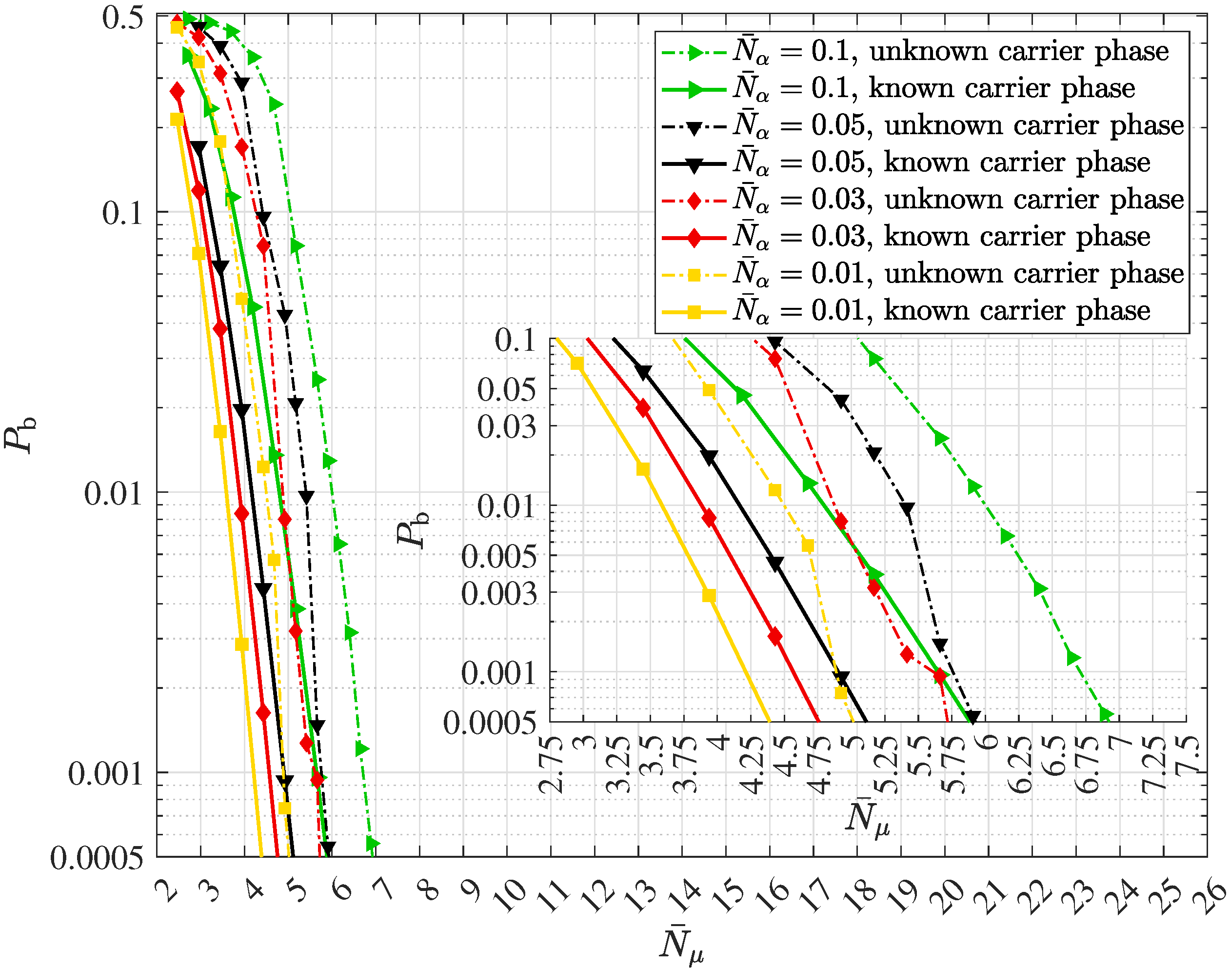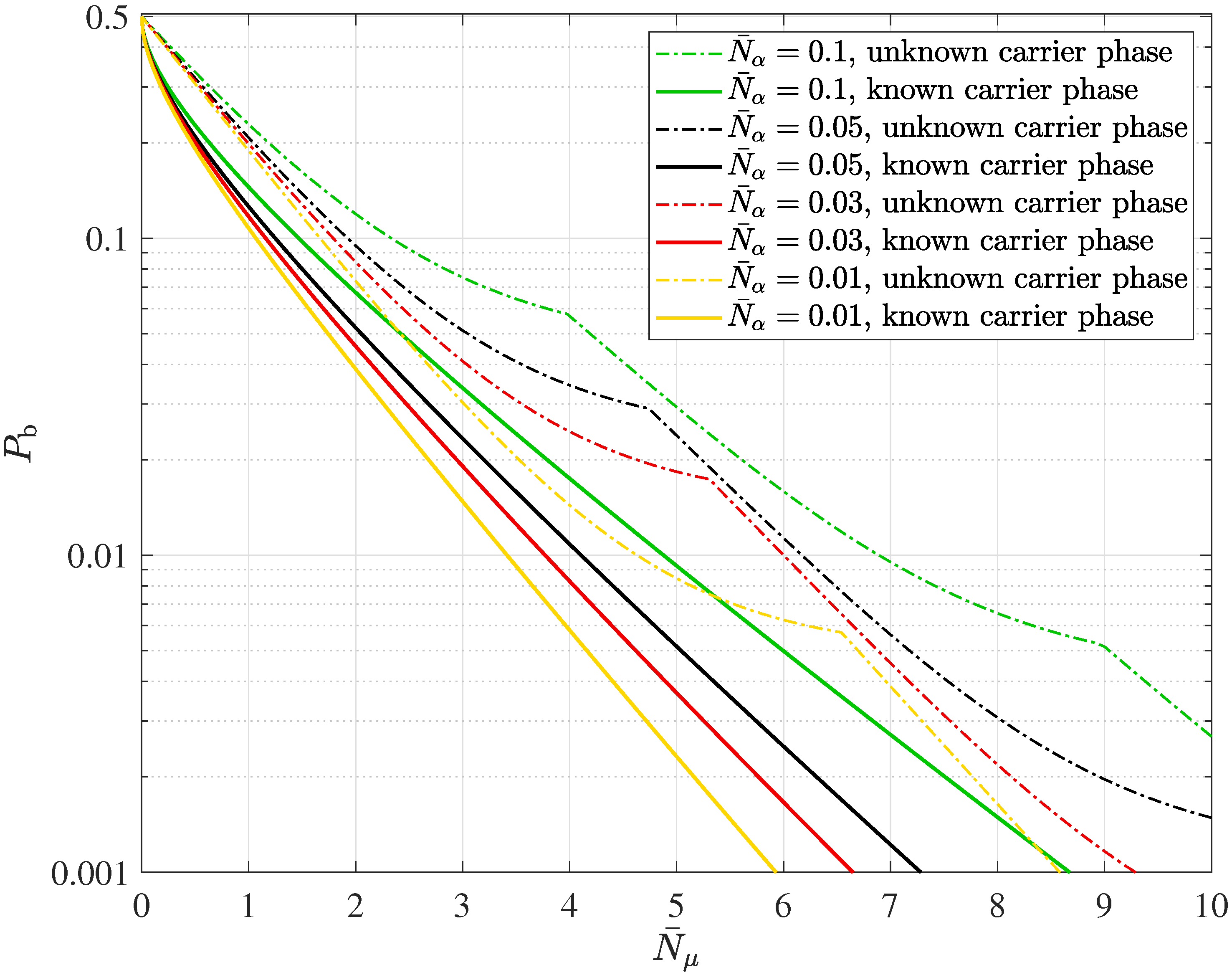 If decoherence, an unknown carrier phase, or both dominate the transmission scenario, the phase of the quantity has to be revisited. The said phase, which is then appropriately modelled as a uniformly distributed random variable, must be averaged out during the data detection process. As a result, all interference terms, that is, all off-diagonal elements in the matrix representation of with respect to the number state basis, vanish. The resulting statistical operator then becomes diagonal, having the matrix representation []