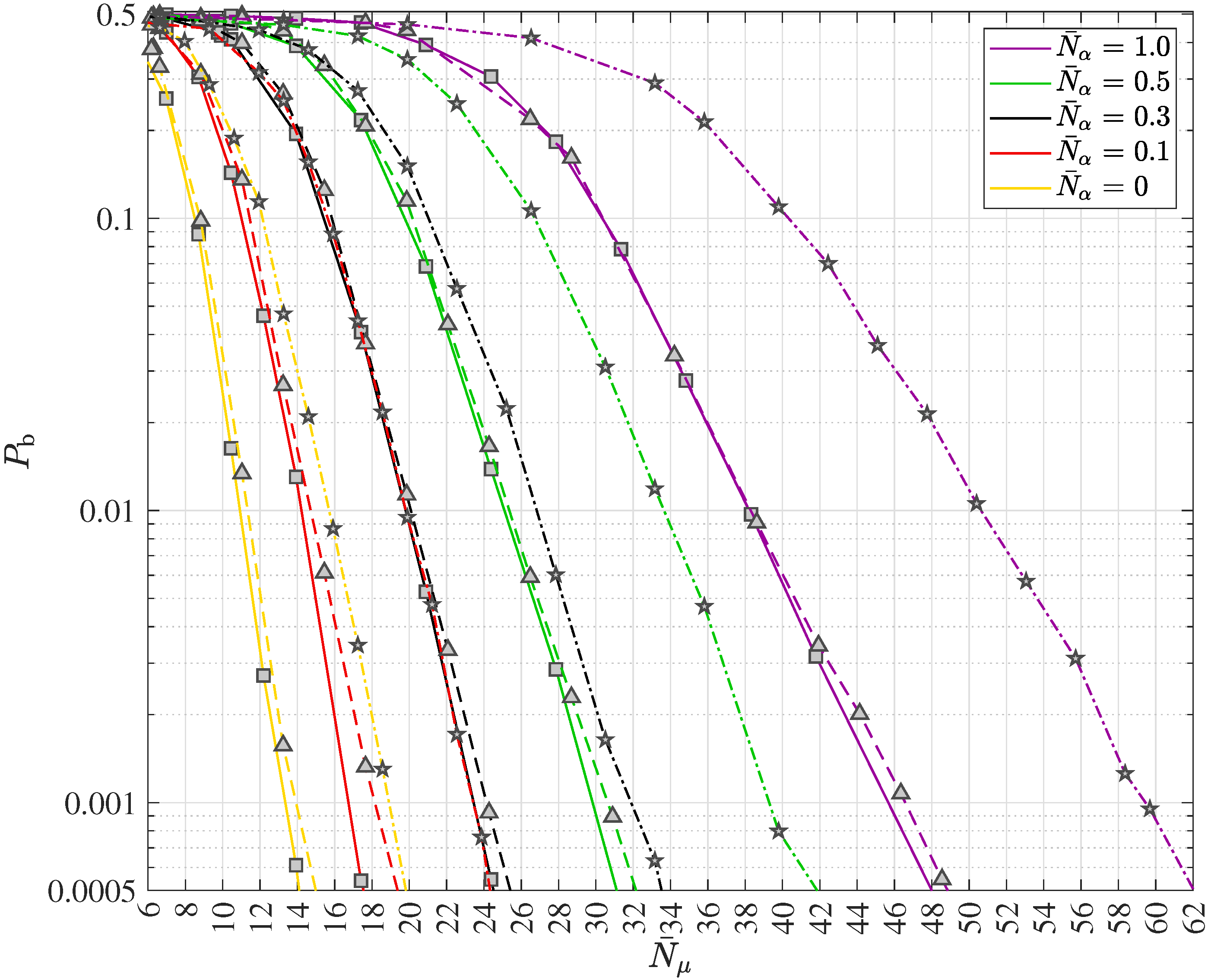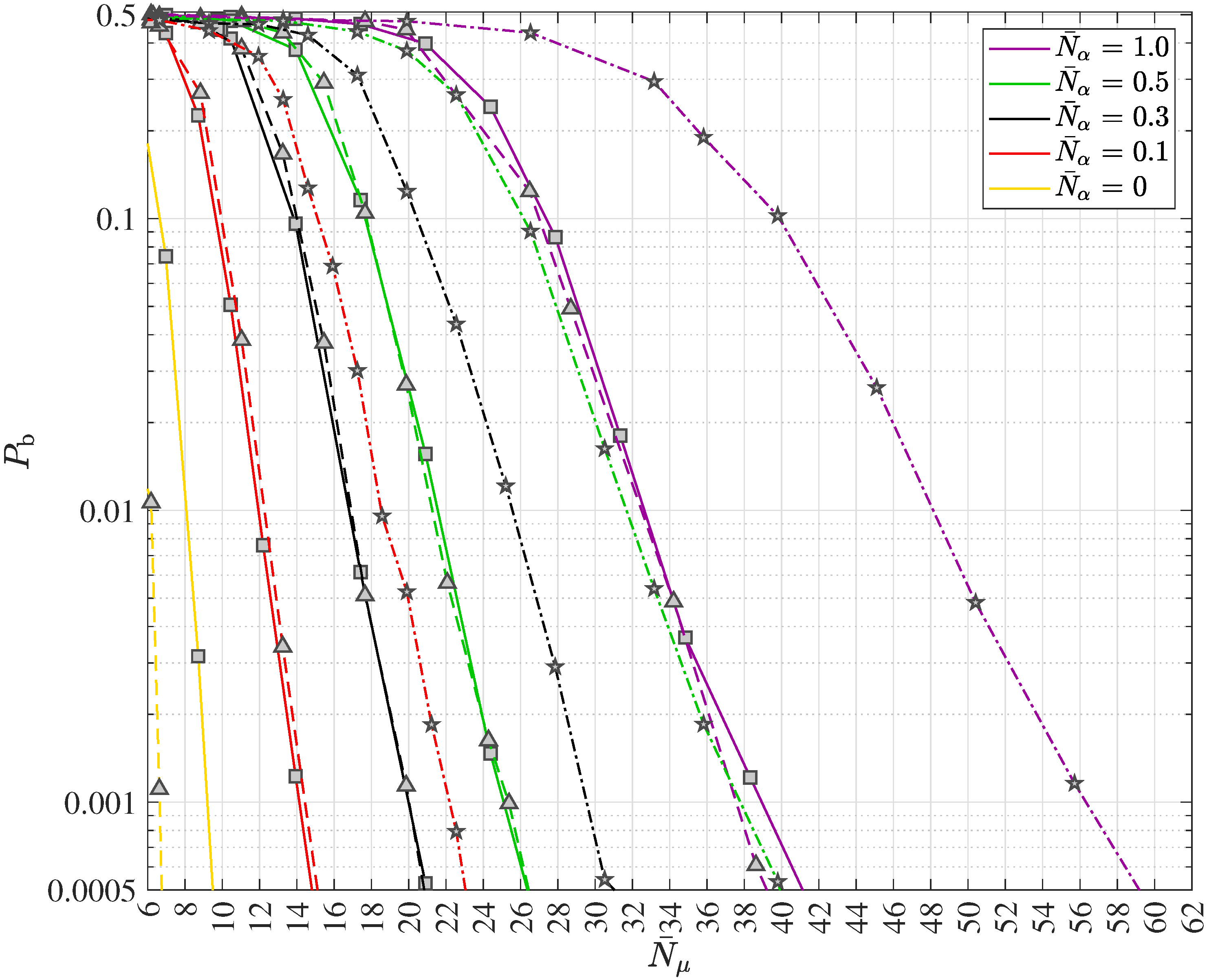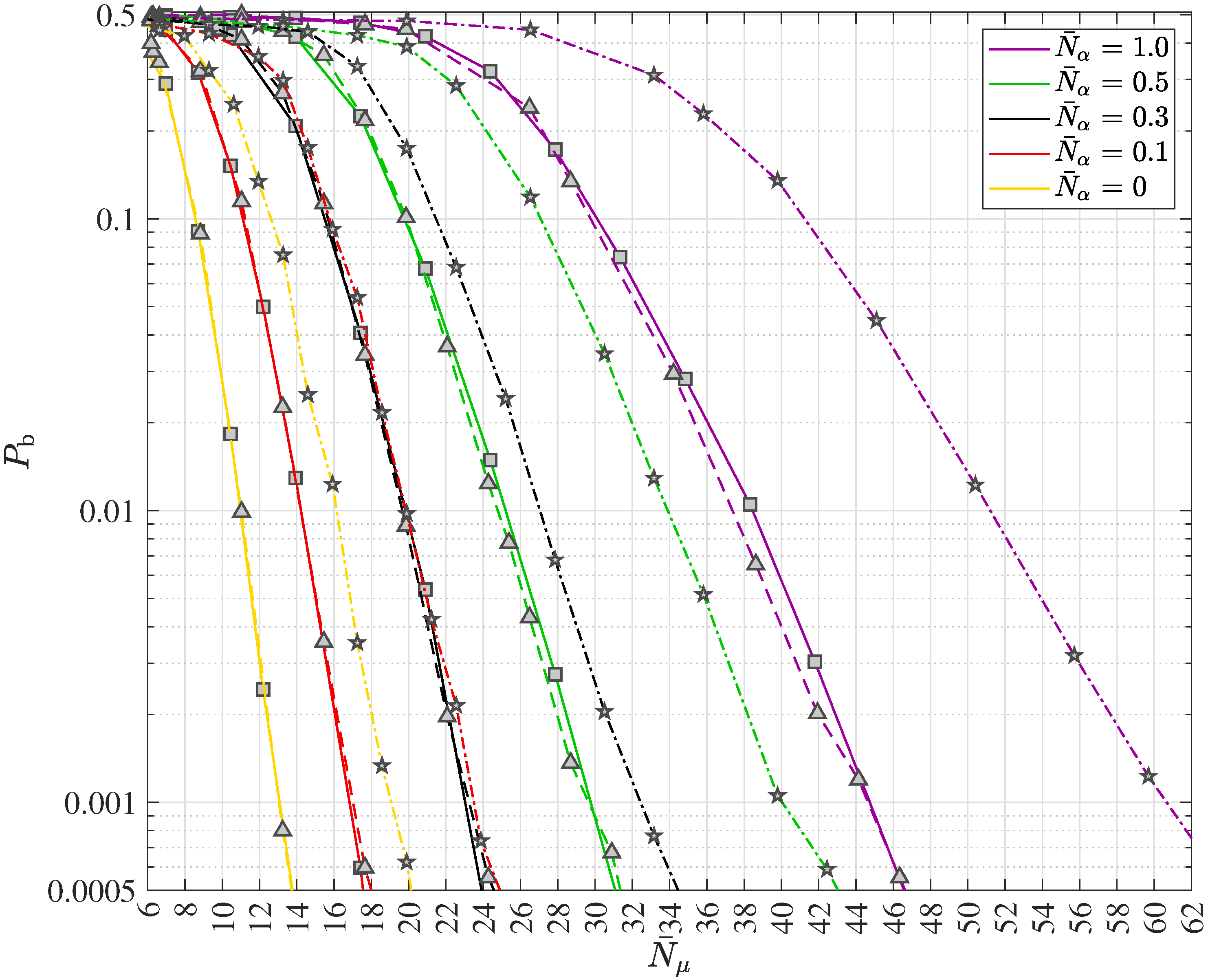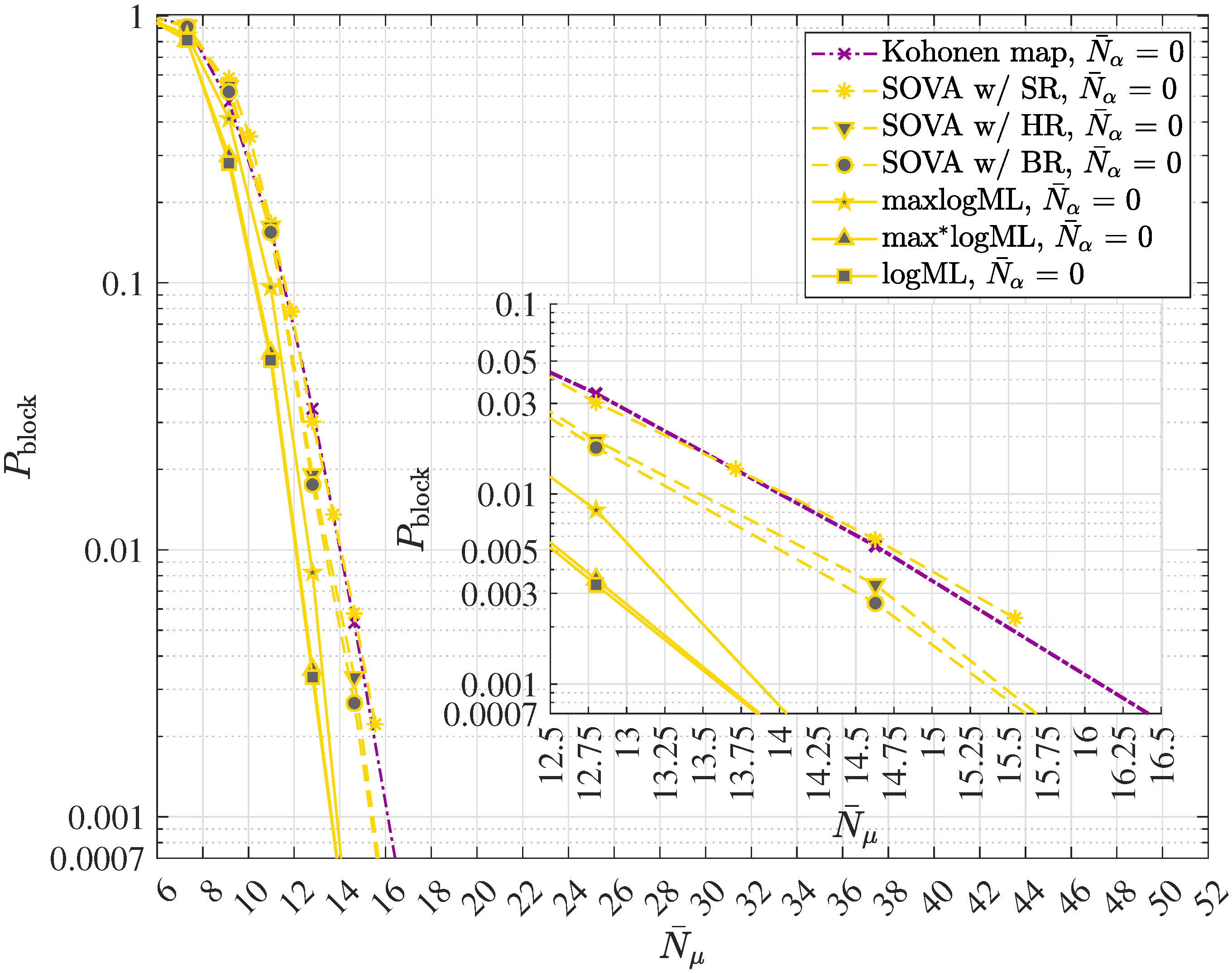 In all shown cases, log-MAP quantum data detection is applied. A total of 24 CRC bits generated with polynomial “24C” are used. The polar code decoding is accomplished with the SC decoder, hence, CRC bits are not processed by the SC decoder. The code length N is equal to 512. Furthermore, three choices of the code dimension, K equal to 171 (—■—), K equal to 256 (- - -▲- - -) and K equal to 410 (- · -★- · -), leading to the three code rates equal to , i.e., (—■—), equal to , i.e., (- - -▲- - -) and equal to , i.e., (- · -★- · -) are considered. Of course, the code rate is explicitly included in . In addition, interleaving according to the illustration in Section 3.3 was deployed. Both the coded BER , respectively the BLER , decreases monotonically with increasing for a given value of . Furthermore, the coded BER , respectively the BLER , increases with increasing thermal noise, i.e., with increasing , for a given value of . Comparing the Figure 19 and Figure 33 as well as Figure 20 and Figure 34, the beneficial effect of turbo equalization on the respective performance becomes obvious. For instance, in the case of equal to , i.e., , no errors were measured in the simulations. Table 6 summarizes the estimated average number of signal photons required to obtain equal to and equal to associated with the results shown in Figure 19, Figure 20, Figure 21 and Figure 22 and Figure 33, Figure 34, Figure 35 and Figure 36.