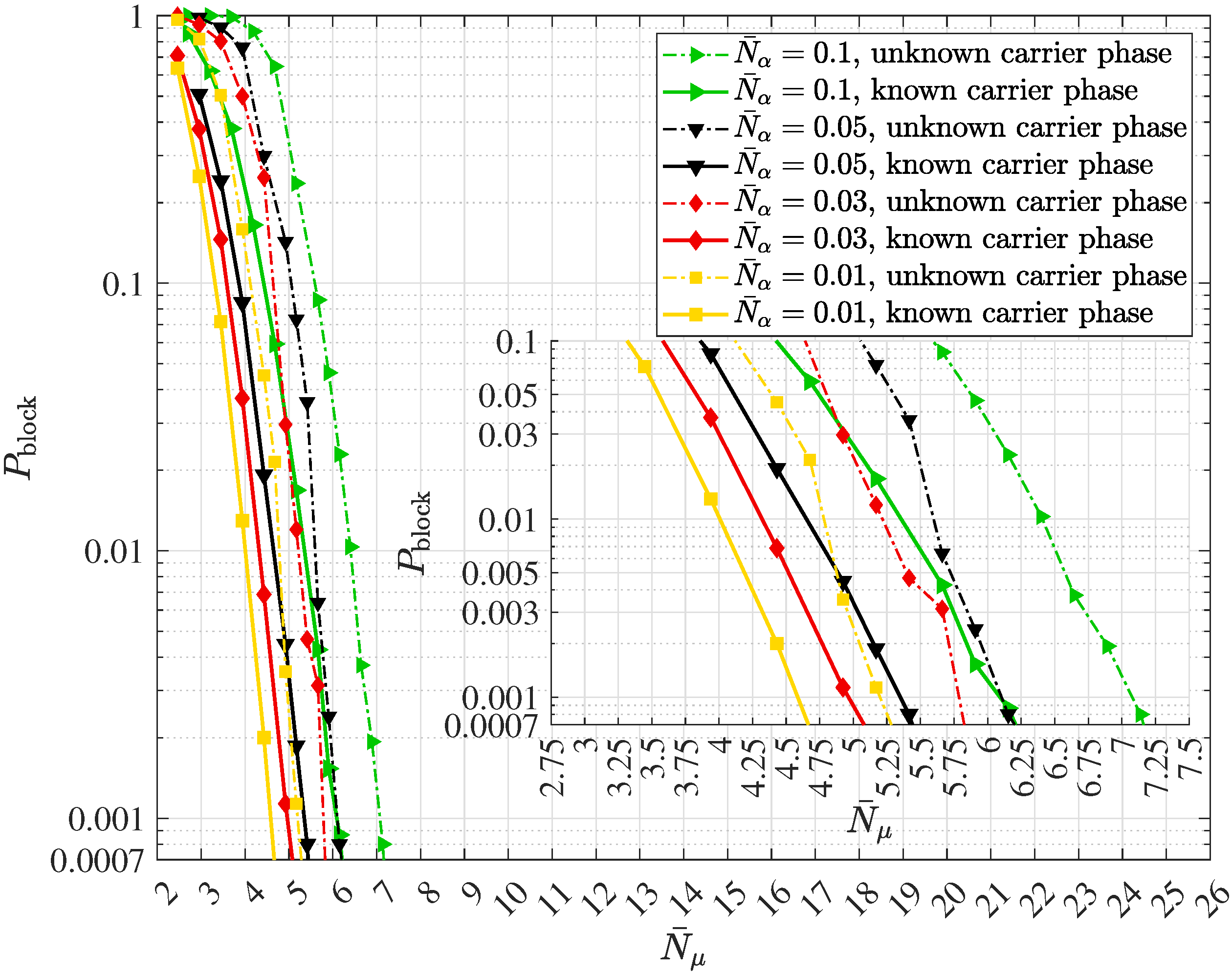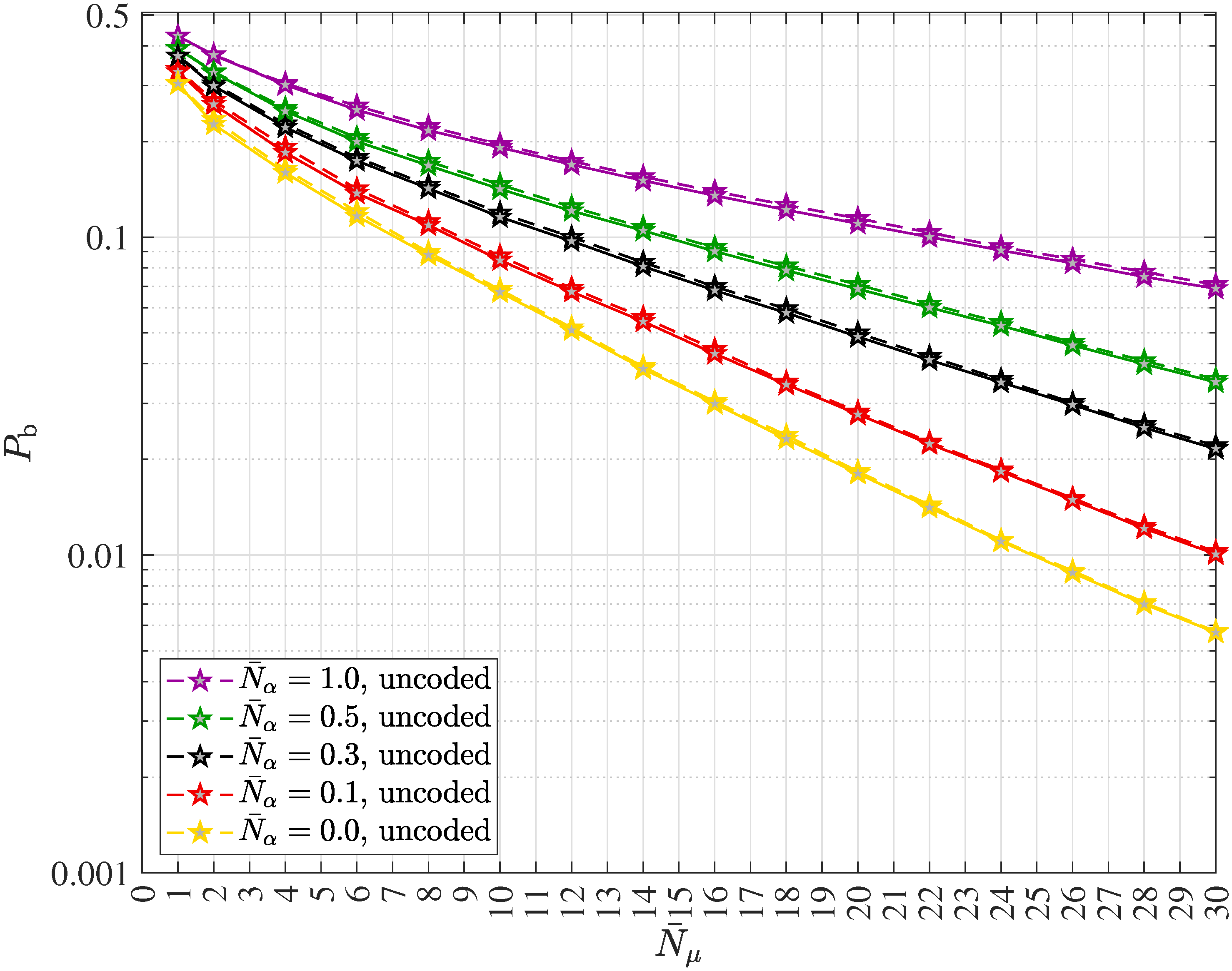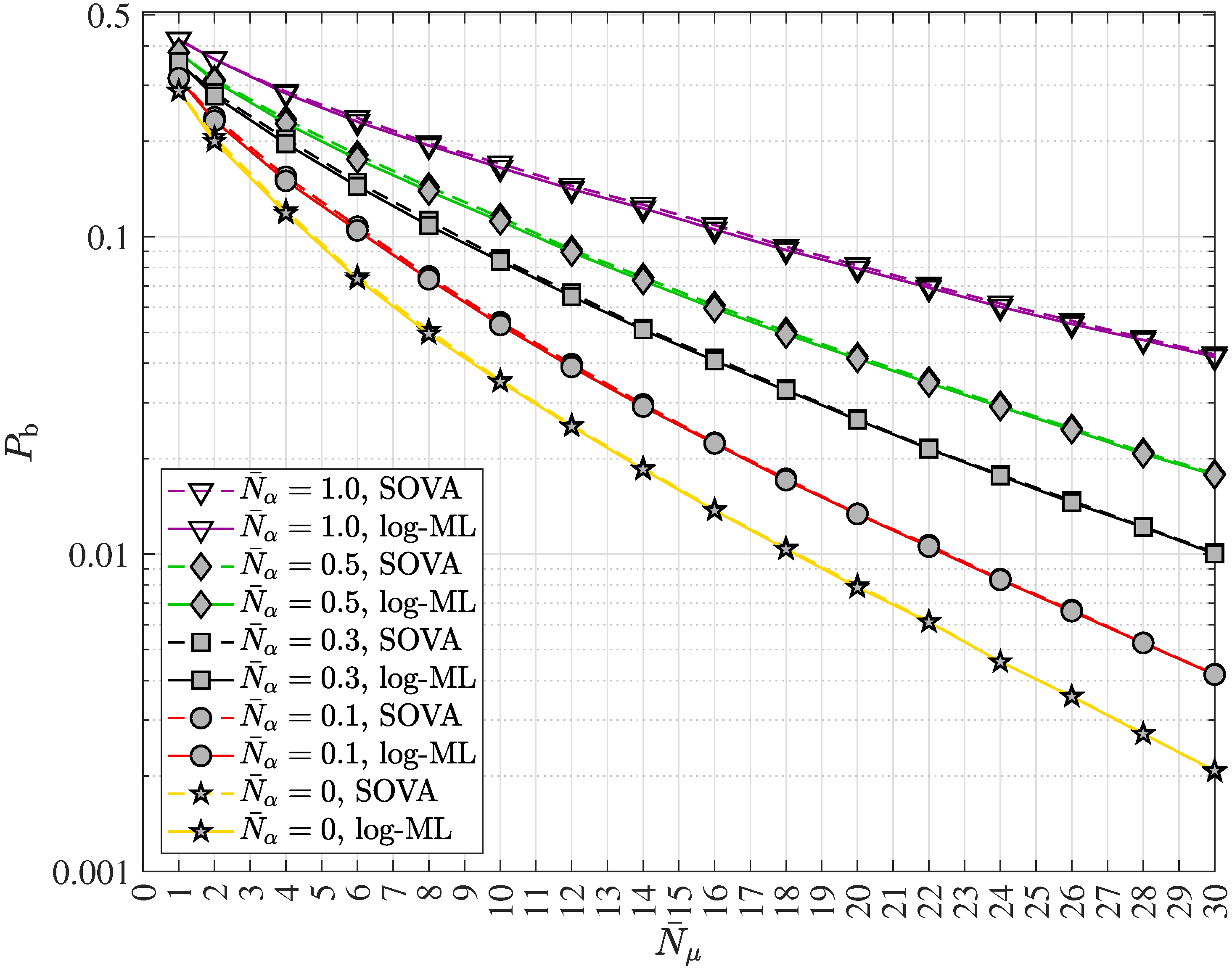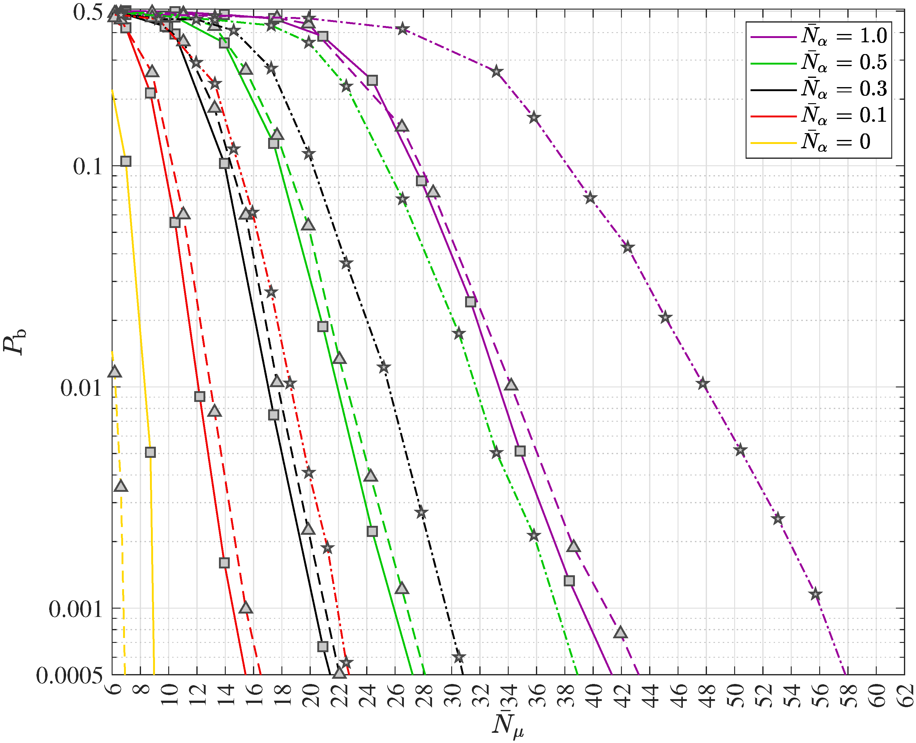 In all shown cases, log-MAP quantum data detection is applied. A total of 24 CRC bits generated with polynomial “24C” are used. The polar code decoding is accomplished with the SC decoder, hence, CRC bits are not processed by the SC decoder. The code length N is equal to 512. Furthermore, three choices of the code dimension, K equal to 171 (—■—), K equal to 256 (- - -▲- - -) and K equal to 410 (- · -★- · -), leading to the three code rates equal to , i.e., (—■—), equal to , i.e., (- - -▲- - -) and equal to , i.e., (- · -★- · -) are considered. Of course, the code rate is explicitly included in . In addition, interleaving according to the illustration in Section 3.3 was deployed. Both the coded BER , respectively the BLER , decreases monotonically with increasing for a given value of . Furthermore, the coded BER , respectively the BLER , increases with increasing thermal noise, i.e., with increasing , for a given value of . Comparing the Figure 19 and Figure 33 as well as Figure 20 and Figure 34, the beneficial effect of turbo equalization on the respective performance becomes obvious. For instance, in the case of equal to , i.e., , no errors were measured in the simulations. Table 6 summarizes the estimated average number of signal photons required to obtain equal to and equal to associated with the results shown in Figure 19, Figure 20, Figure 21 and Figure 22 and Figure 33, Figure 34, Figure 35 and Figure 36.