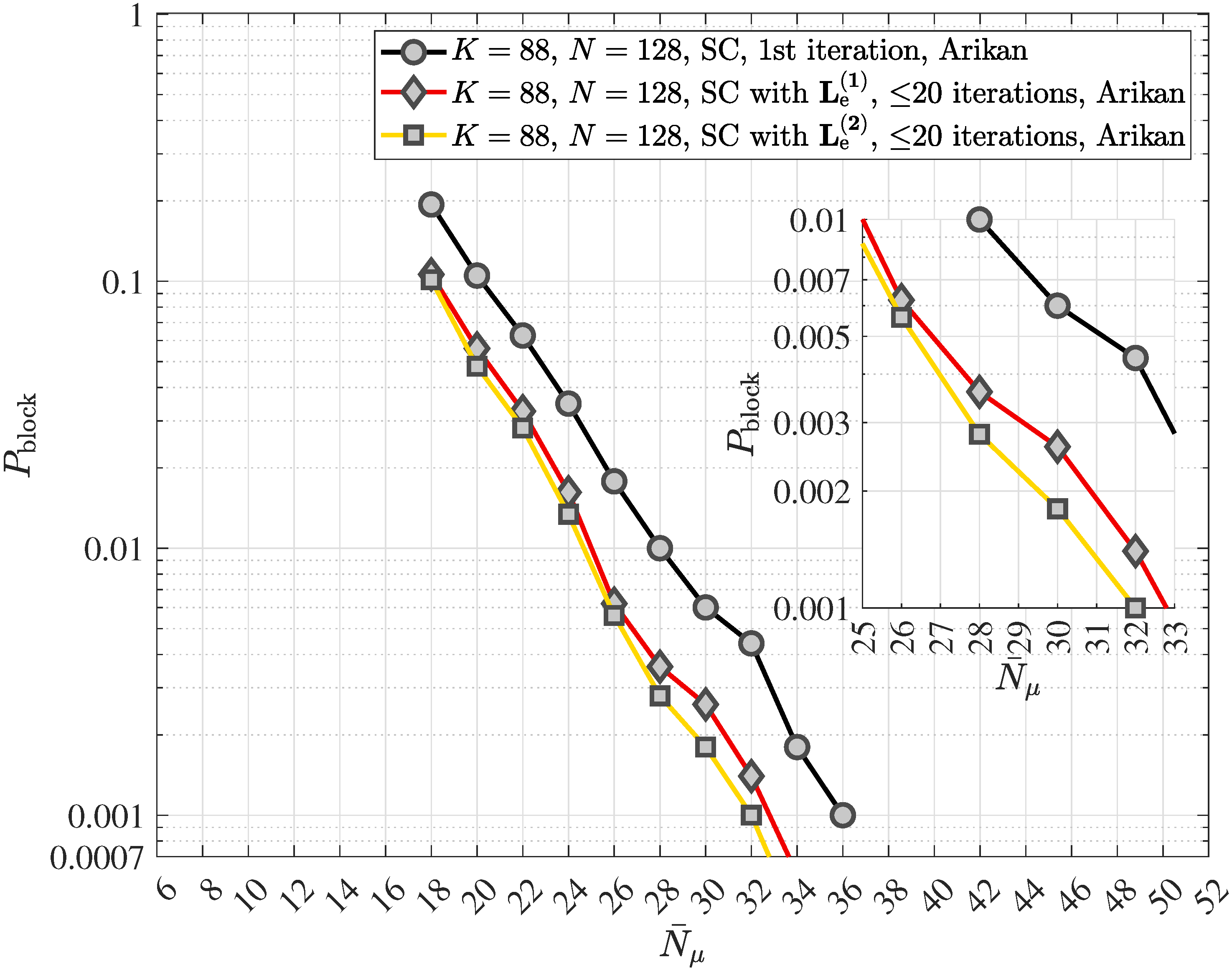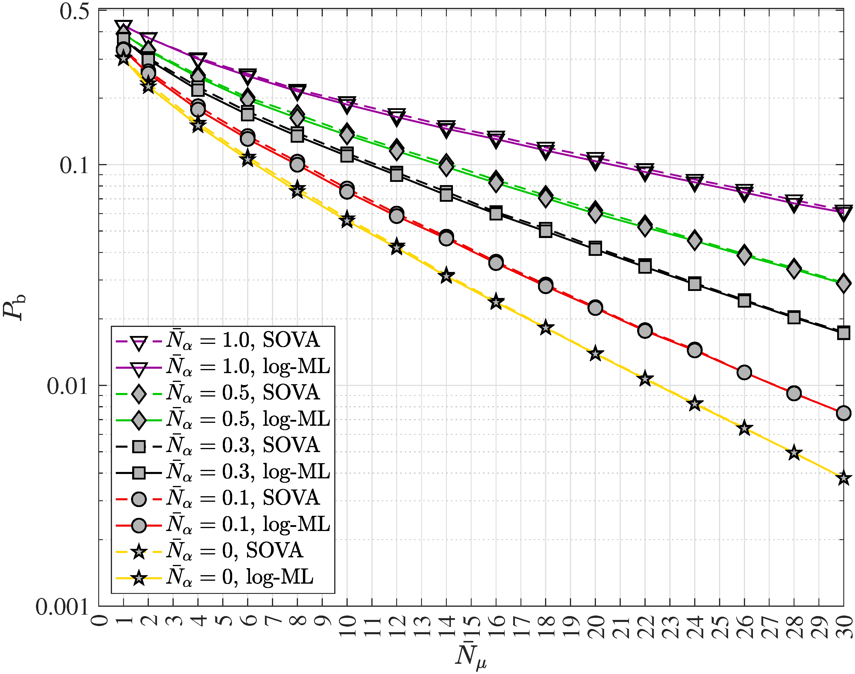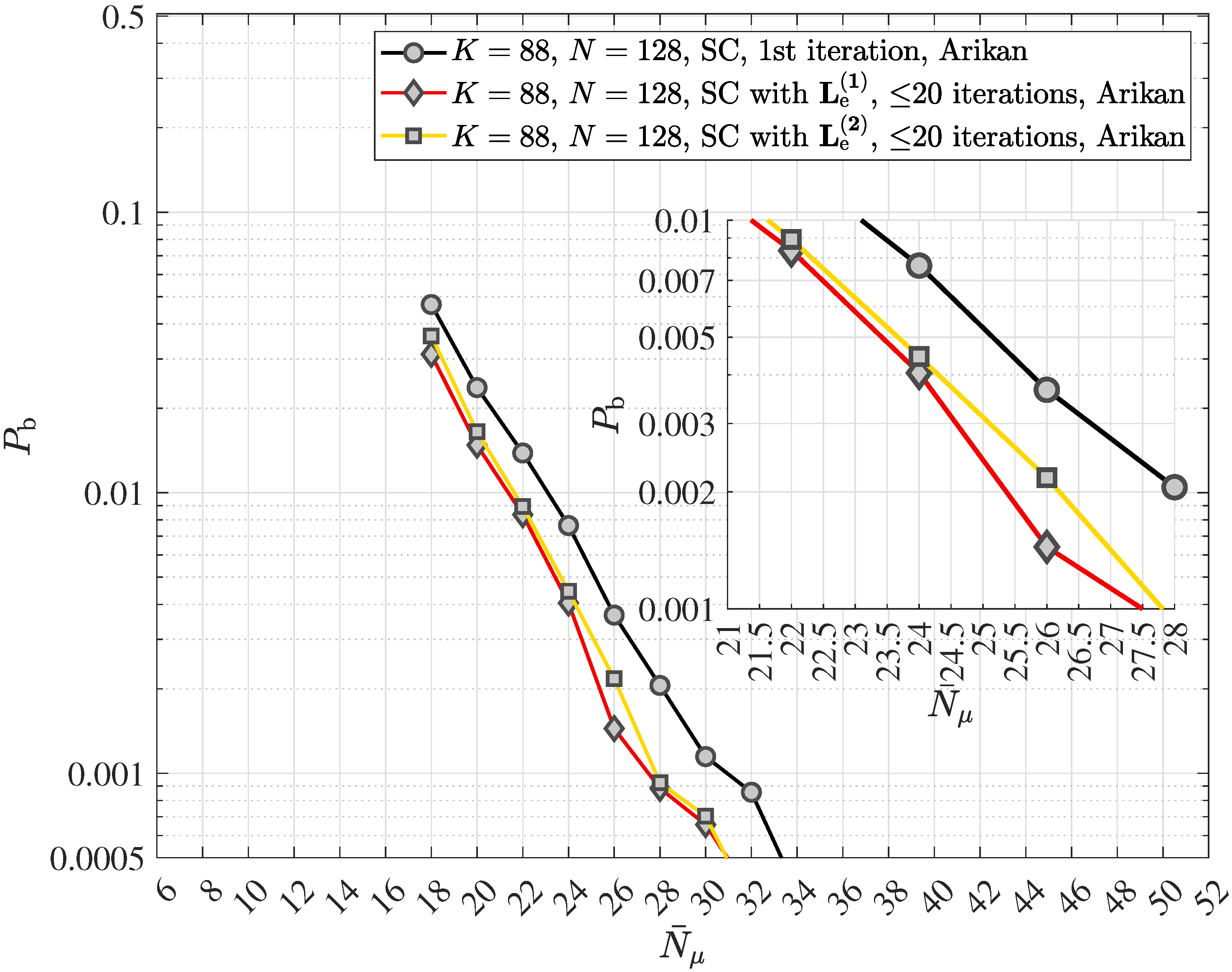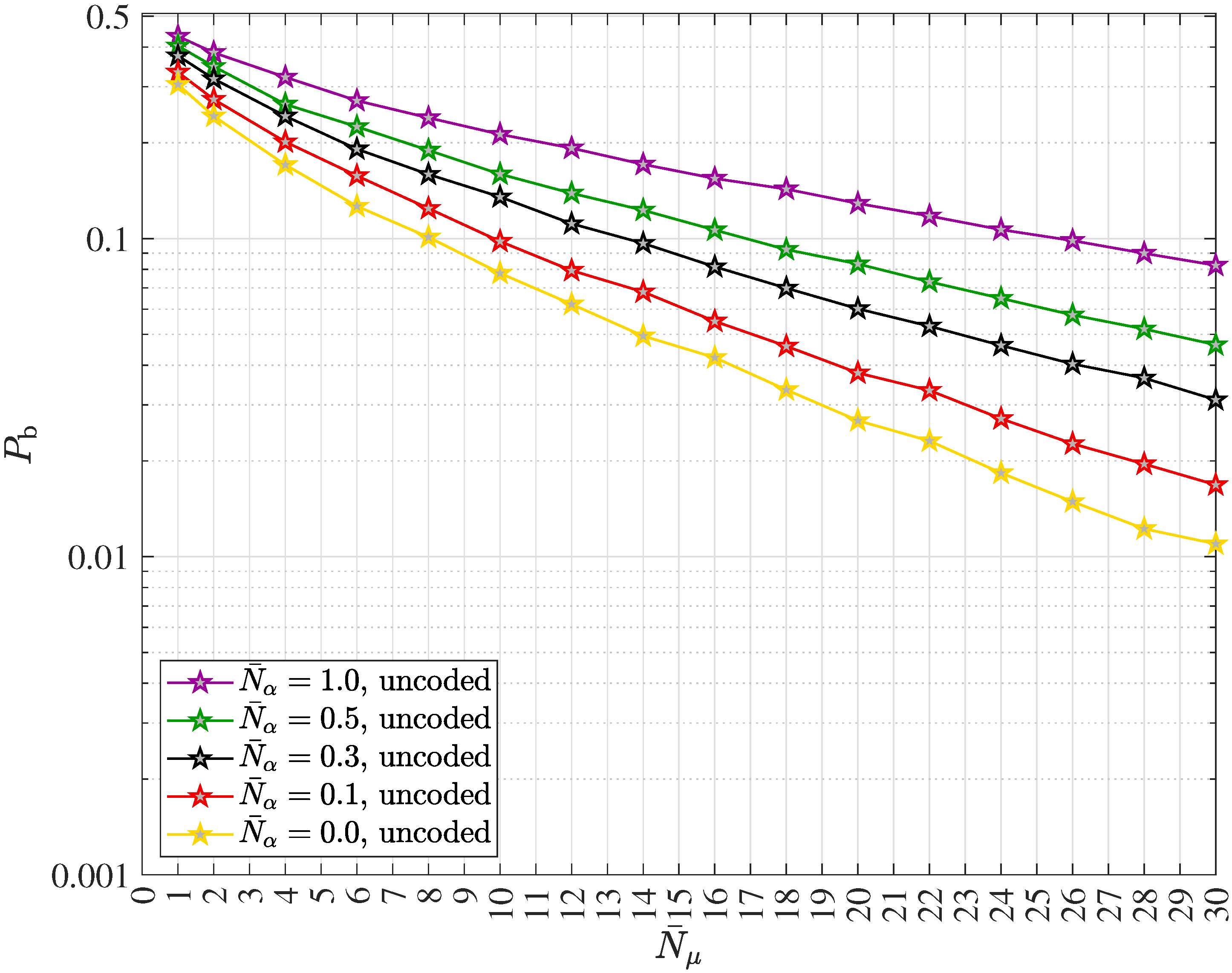 In all shown cases, log-MAP quantum data detection is applied. A total of 24 CRC bits generated with polynomial “24C” are used. The polar code decoding is accomplished with the SC decoder, hence, CRC bits are not processed by the SC decoder. The code length N is equal to 512. Furthermore, three choices of the code dimension, K equal to 171 (—■—), K equal to 256 (- - -▲- - -) and K equal to 410 (- · -★- · -), leading to the three code rates equal to , i.e., (—■—), equal to , i.e., (- - -▲- - -) and equal to , i.e., (- · -★- · -) are considered. Of course, the code rate is explicitly included in . In addition, interleaving according to the illustration in Section 3.3 was deployed. Both the coded BER , respectively the BLER , decreases monotonically with increasing for a given value of . Furthermore, the coded BER , respectively the BLER , increases with increasing thermal noise, i.e., with increasing , for a given value of . Comparing the Figure 19 and Figure 33 as well as Figure 20 and Figure 34, the beneficial effect of turbo equalization on the respective performance becomes obvious. For instance, in the case of equal to , i.e., , no errors were measured in the simulations. Table 6 summarizes the estimated average number of signal photons required to obtain equal to and equal to associated with the results shown in Figure 19, Figure 20, Figure 21 and Figure 22 and Figure 33, Figure 34, Figure 35 and Figure 36.