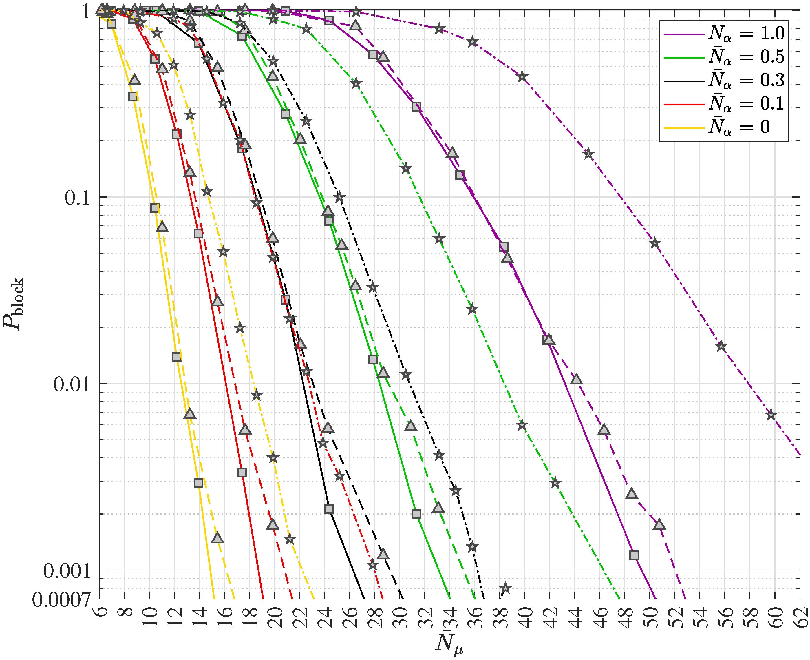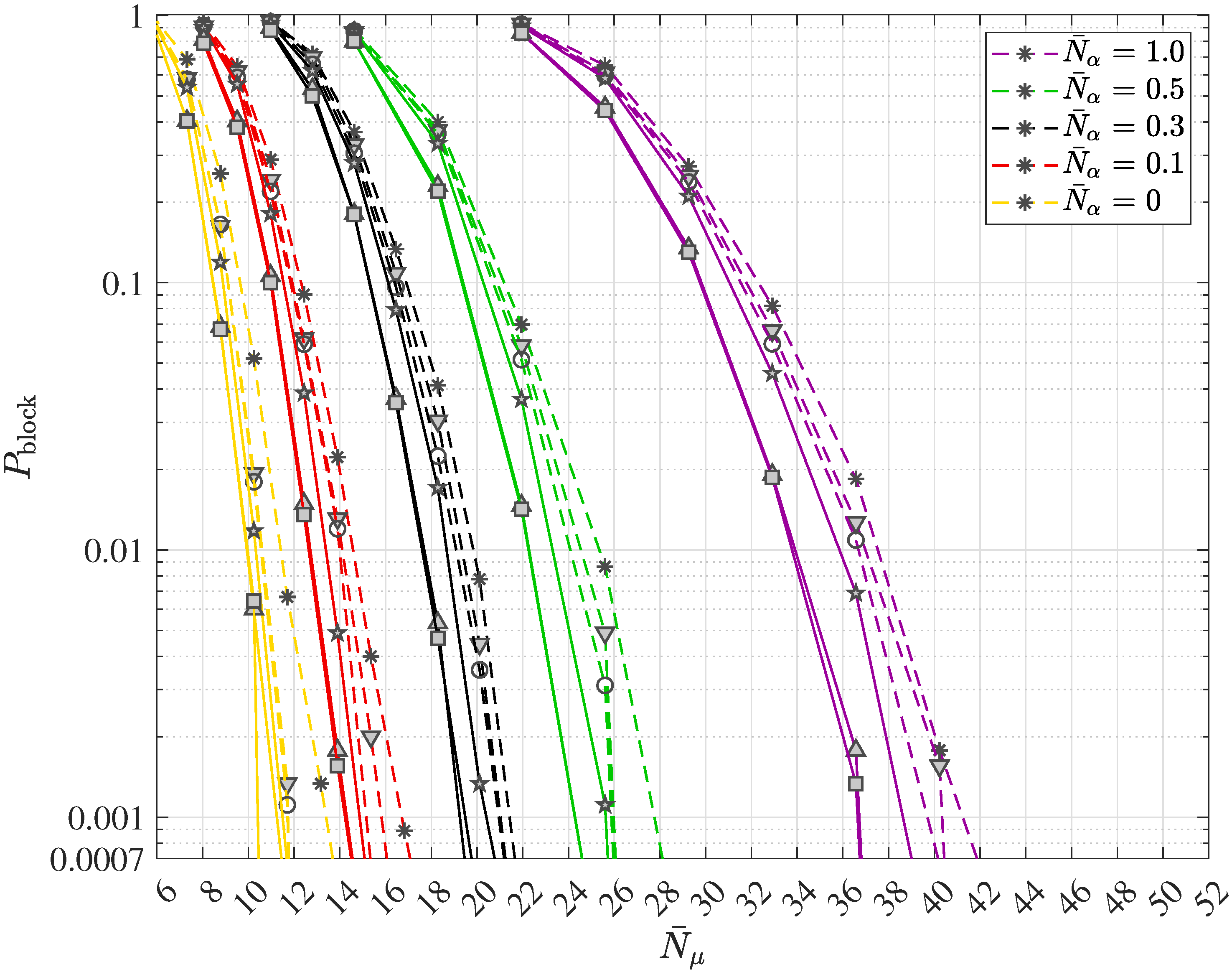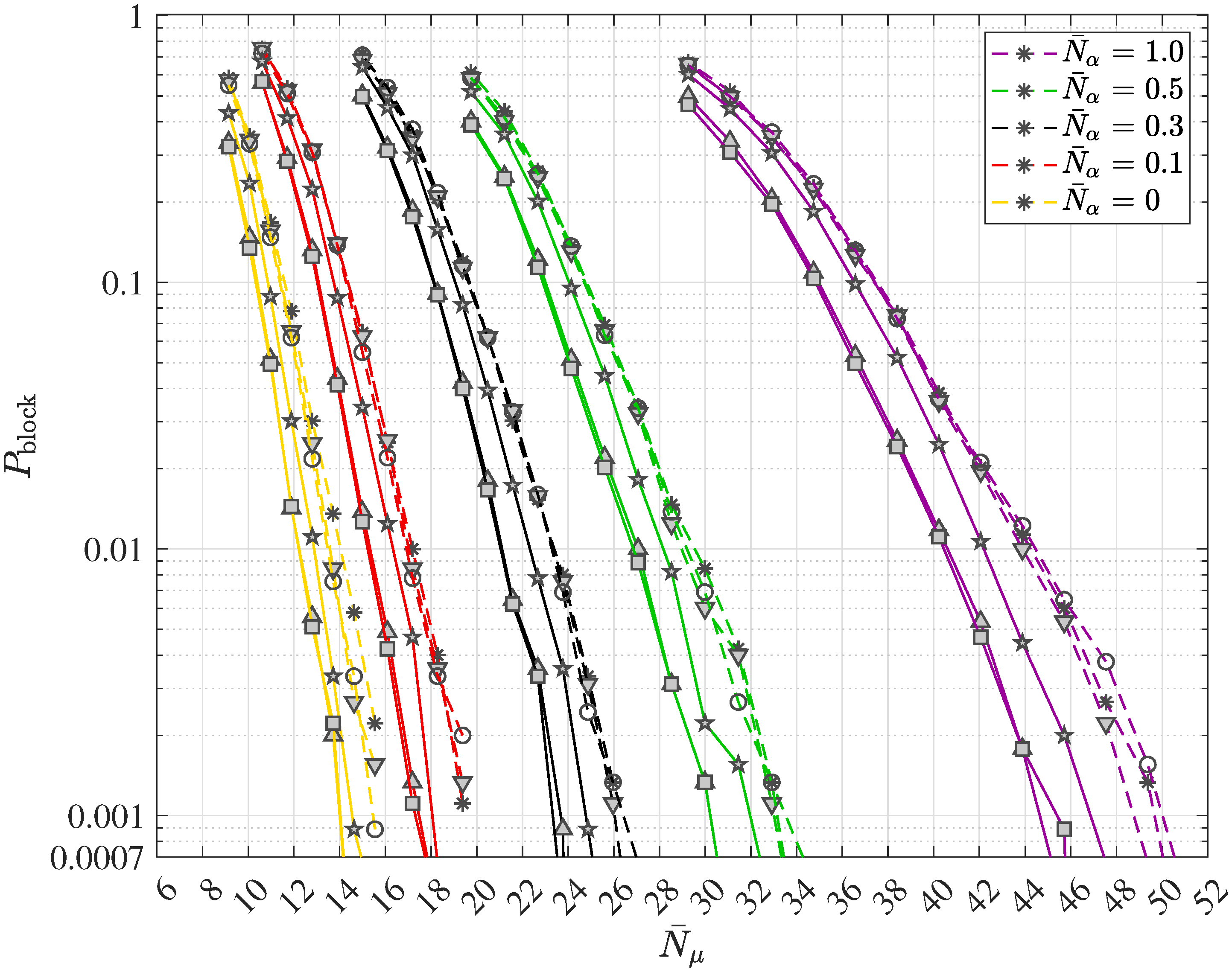 Detail of simulation results of the block error ratio (BLER) performance versus the average number of signal photons per message bit with the average number of thermal photons as the curve parameter for the transmission via the multipath quantum channel CIR#4, cf. Figure 20, when turbo equalization with at most 16 iterations is taken into account; log-MAP quantum data detection is applied; the 3GPP 5G/NR polar code with the generator matrix of (72) and the polar sequence of ([], Table 5.3.1.2-1, pp. 17–19) is used; 24 CRC bits generated with polynomial “24C” are used; the polar code decoding is accomplished with the SC decoder, hence, CRC bits are not processed by the SC decoder; the code length N is 512; three choices of the code dimension, (—■—), (- - -▲- - -) and (- · -★- · -), leading to the three code rates (—■—), (- - -▲- - -) and (- · -★- · -) are considered; the code rate is explicitly included in ; interleaving is deployed.
