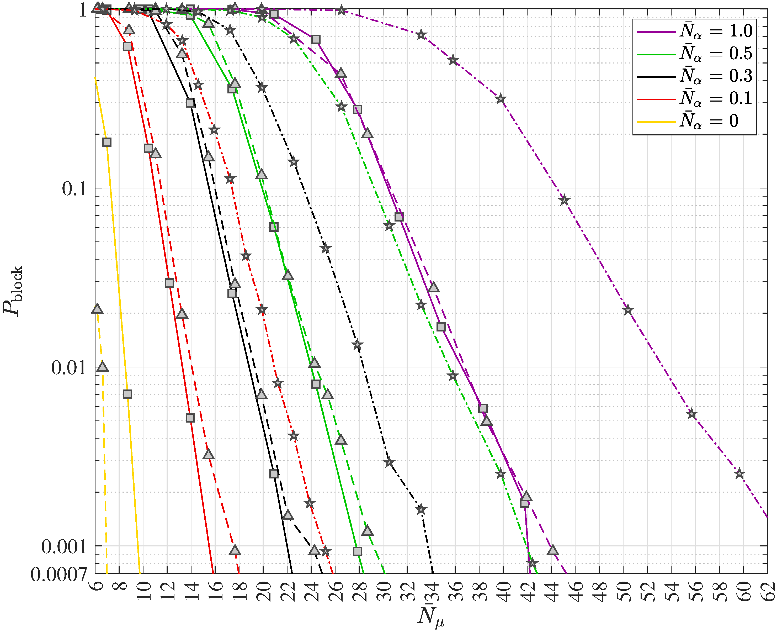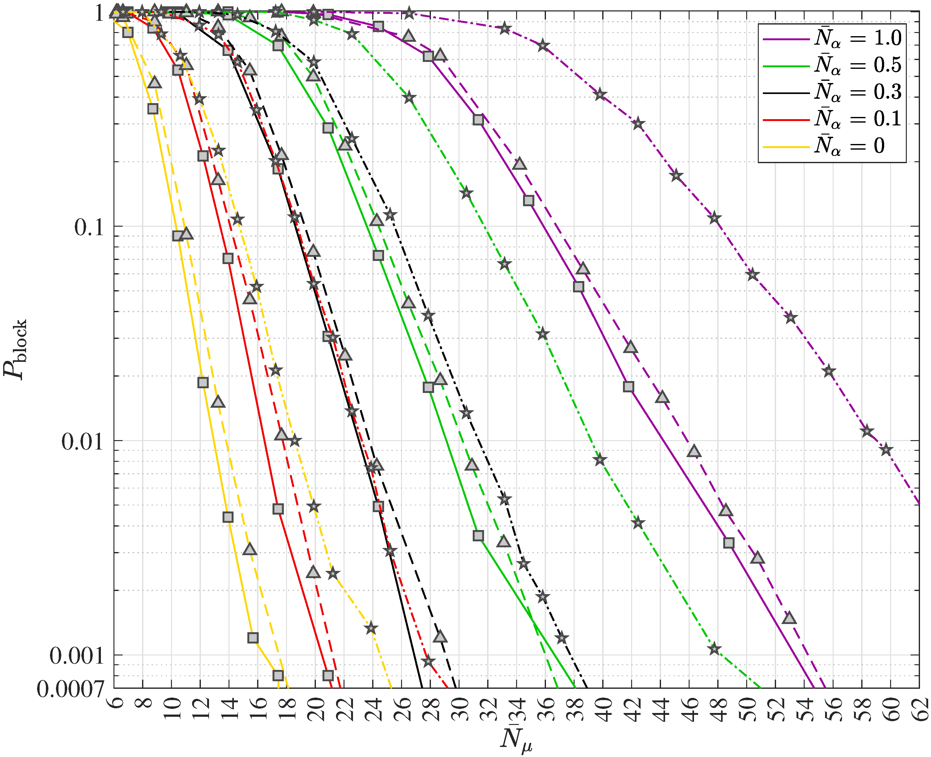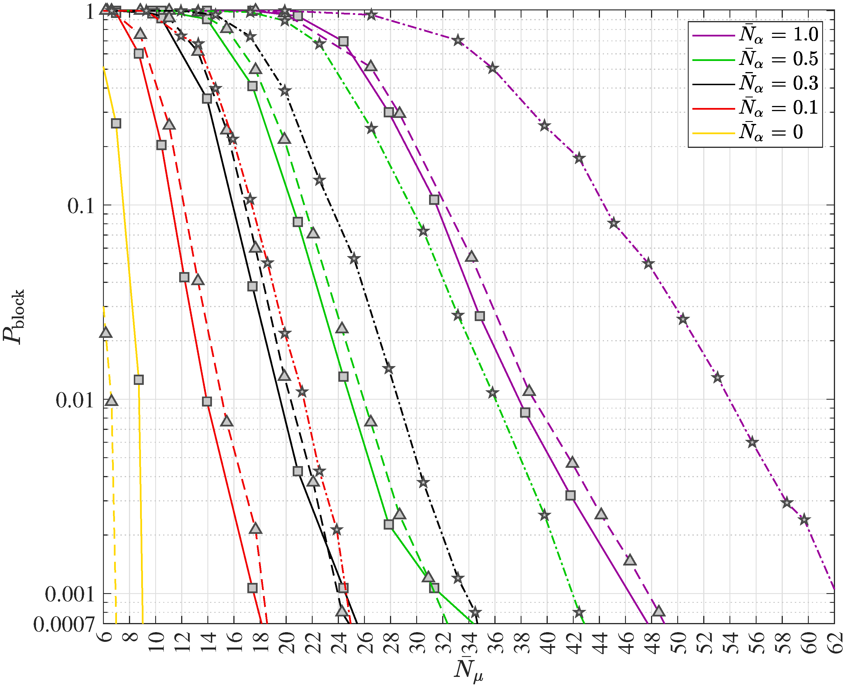 Detail of simulation results of the block error ratio (BLER) performance versus the average number of signal photons per message bit with the average number of thermal photons as the curve parameter for the transmission via the multipath quantum channel CIR#4, cf. Figure 20, when turbo equalization with at most 16 iterations is taken into account; log-MAP quantum data detection is applied; the Arikan-style polar code with the generator matrix of (73) and the associated polar sequence generated by Arikan’s Bhattacharyya parameter based approach setting out from the binary erasure channel with erasure probability is used; 24 CRC bits generated with polynomial “24C” are used; the polar code decoding is accomplished with the SC decoder, hence, CRC bits are not processed by the SC decoder; the code length N is 512; three choices of the code dimension, (—■—), (- - -▲- - -) and (- · -★- · -), leading to the three code rates (—■—), (- - -▲- - -) and (- · -★- · -) are considered; the code rate is explicitly included in ; interleaving is deployed.