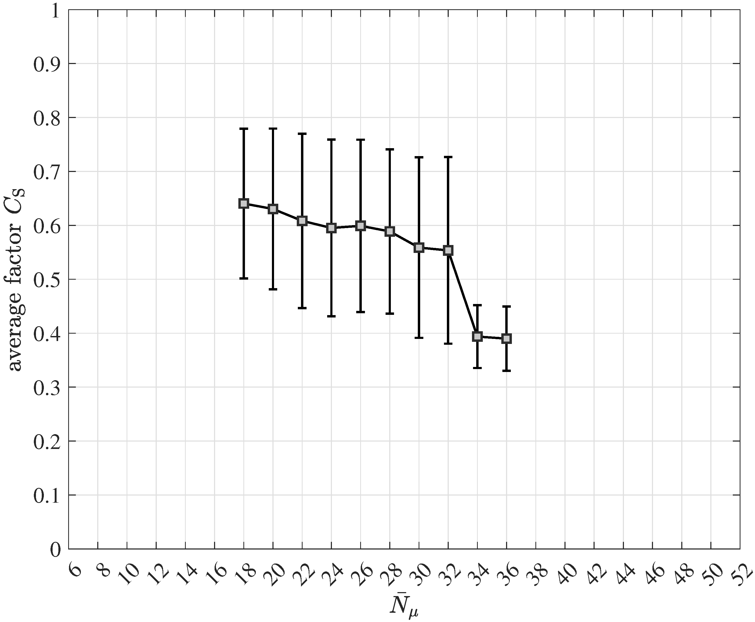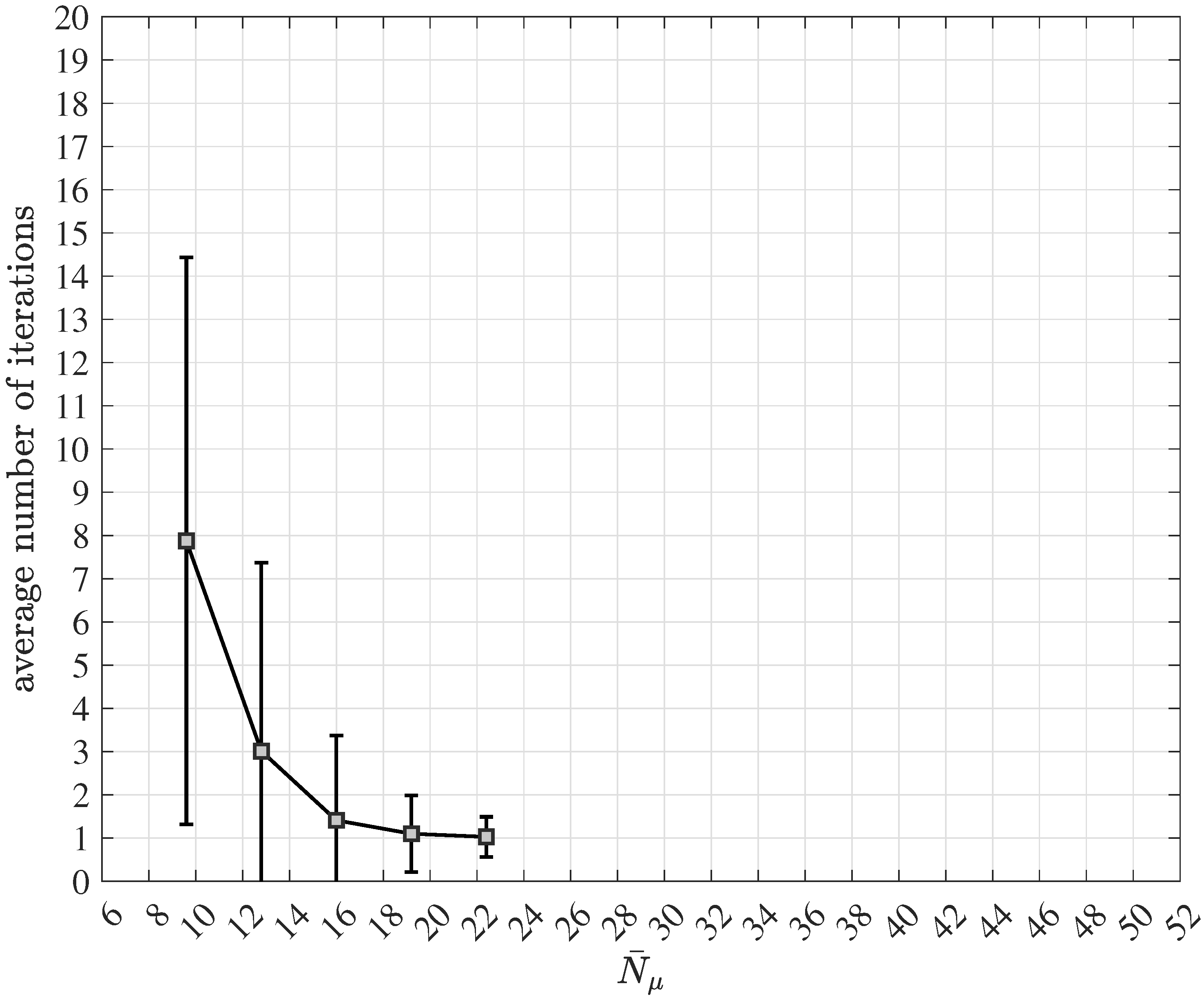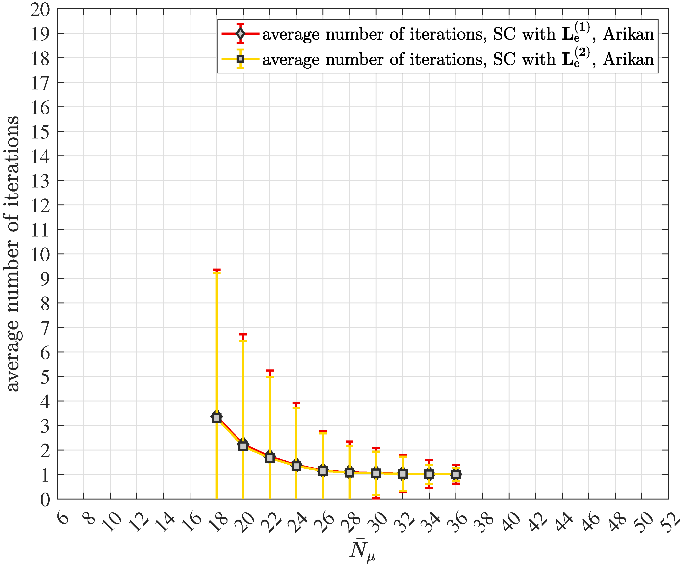 Average number of turbo equalization iterations versus the average number of signal photons per message bit required to obtain the simulation results labelled by “, SC, iterations, Arikan”, shown in Figure 31; the error bars indicate the estimated standard deviation in both the positive and negative directions.