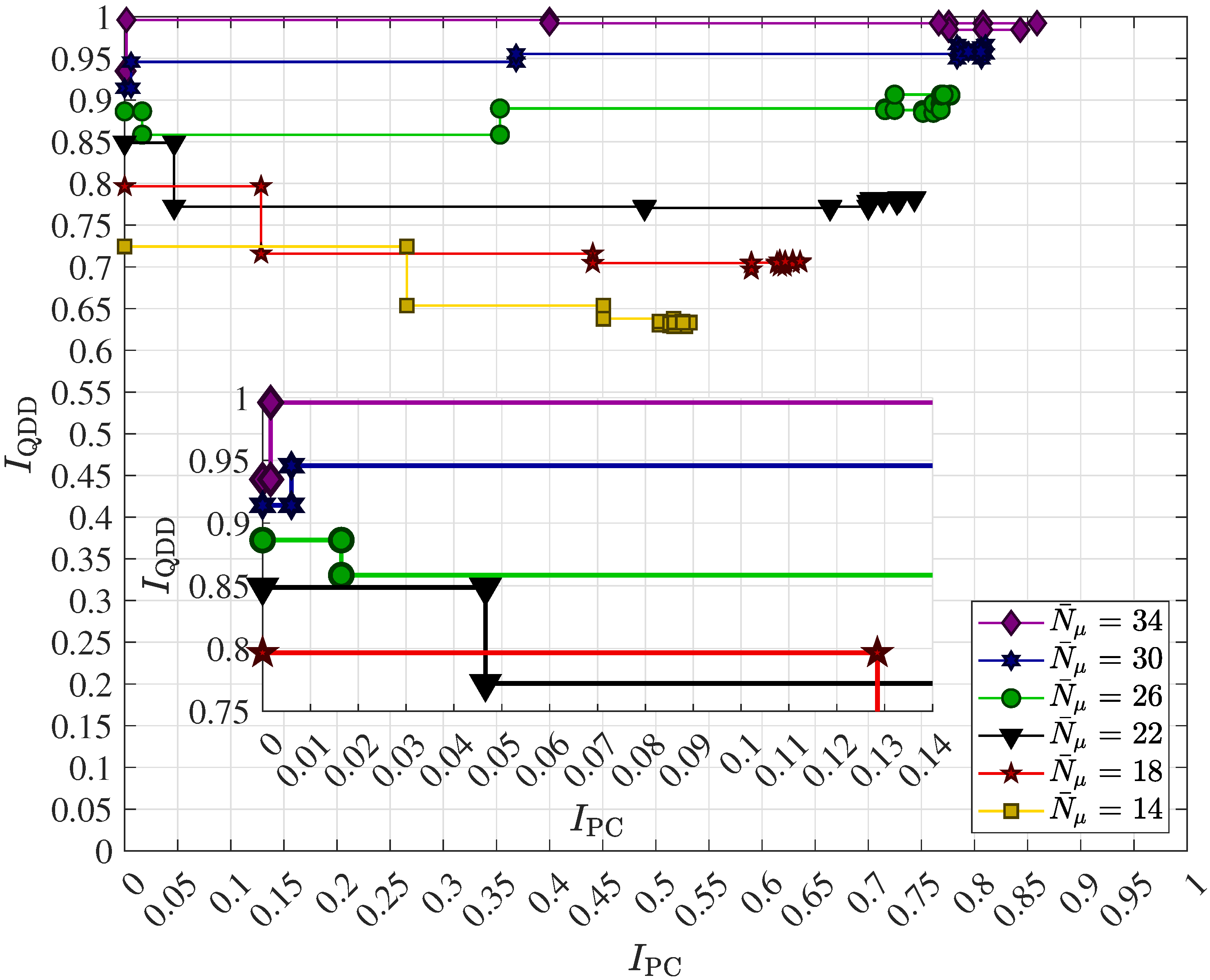 Figure 37 shows simulation results of the estimated mutual information , cf. (97), versus the estimated mutual information , cf. (98), in the case of six different values of . Like in the original EXIT charts, each horizontal line refers to a distinct iteration of the turbo equalization, the leftmost line associated with a particular referring to the respective first iteration. The multipath quantum channel CIR#5 is considered and the average number of thermal photons is equal to 0. The Arikan-style polar code with the generator matrix of (73) and the associated polar sequence generated by Arikan’s Bhattacharyya parameter -based approach setting out from the binary erasure channel with erasure probability equal to is used. As usual for the simulations discussed in this Section 4.5, 24 CRC bits generated with polynomial “24C” are applied for the termination control of the turbo equalization. The code dimension K is equal to 88 and the code length N is equal to 128, yielding the code rate equal to , i.e., . SC decoding and log-MAP quantum data detection are used. Also, block interleaving according to the illustration in Section 3.3 is deployed.