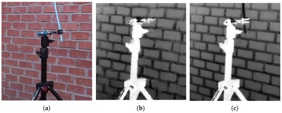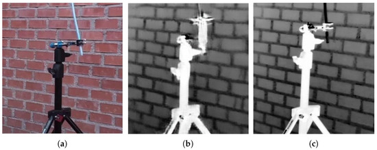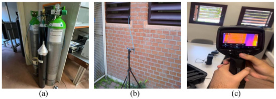 Experimental setup in laboratory environment for collecting dataset (D1): (a) gas cylinder, (b) a hose mounted on a stand used for the experiment, and (c) the FLIR thermal camera.