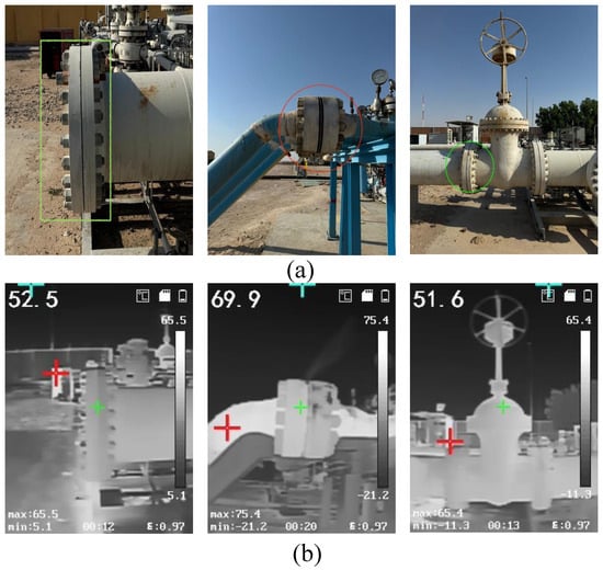 Industrial data D2 collected in Halfaya oil and gas industry: (a) RGB images, where the red circle indicates the leakage while green shows no leakage case, (b) corresponding thermal images.