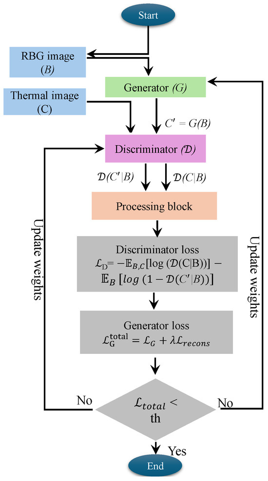 Training proceeds until equilibrium is reached, where the discriminator cannot reliably distinguish real from generated images. Upon convergence, the process terminates successfully, providing a validated thermal image that highlights probable gas leakage locations correlated with the RGB input’s ice accumulation patterns.