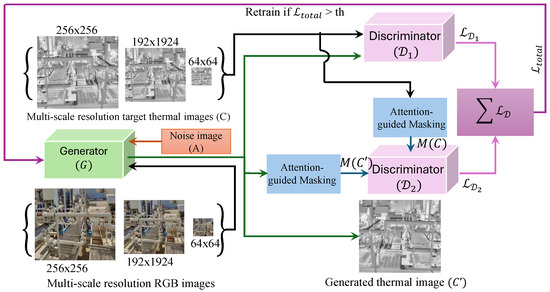 Both the generator and discriminator components of the proposed model have been modified. On the generator side, the noise image A and multi-scale resolution RGB images B are provided as inputs. Specifically, image pairs at three different resolutions , , and pixels-are used, representing , , and of the original image resolution, respectively. This multi-scale approach allows the generator to capture features across different levels of features, which improve its ability to generate realistic thermal images even with the small dataset. This multi-scale input strategy can be mathematically formalized as