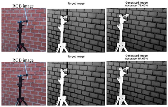 The test set consists of a video sequence provided as input to the model. Frames are extracted at a fixed frame rate and processed through the attention-guided masking module, after which the trained weights of the GAN models are employed to make inference. Evaluation of the model’s performance relies on three key metrics, i.e., SSIM, PSNR, and Accuracy. The efficacy of the proposed MSDD-GAN model in successfully generating thermal images from RGB images is visually demonstrated in Figure 11 and Figure 12. These figures showcase the model’s ability to generate thermal images that closely match the target images in terms of gas leakage representation.