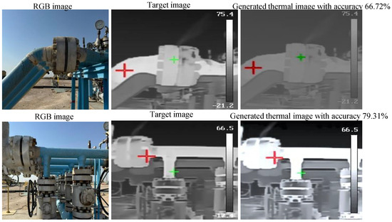 Further comparative results with Pix2Pix GAN [45] and CycleGAN [46] models show that baseline Pix2Pix GAN yielded lower SSIM (0.6876) and PSNR (21.09 dB) demonstrating inferior performance, especially in gas leak region generation. CycleGAN attained even lower SSIM (0.3084) and PSNR (12.41 dB), generating thermal images with reasonable background quality but poor localization in gad leakage areas. This highlights the necessity for a masked loss function to direct the model’s focus and penalize error more strongly in relevant regions. Figure 17 and Figure 18 present the qualitative results corresponding to the Pix2Pix GAN [45] and CycleGAN, respectively. These images show that the state-of-the-art models fail to accurately generate thermal images, particularly in the gas leakage areas.
