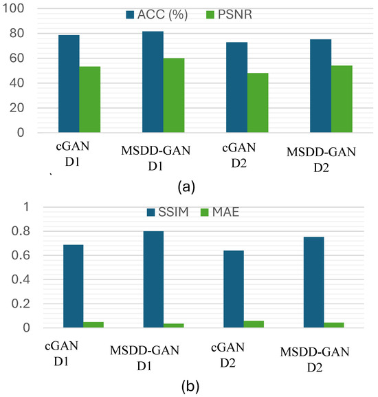 Boxplot of performance metrics for the comparison of cGAN and MSDD-GAN with both D1 and D2 datasets, (a) accuracy (%) and PSNR (dB), and (b) SSIM and MAE.