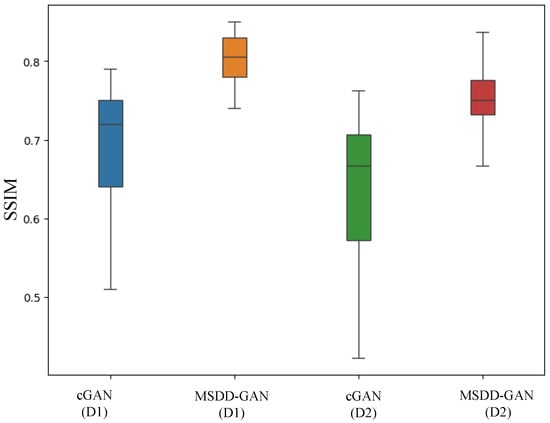 The MSDD-GAN demonstrates superior performance with a median SSIM (Equation (10)) of 0.801, compared to cGAN’s median SSIM of 0.72 for dataset collected in laboratory environment D1 (Figure 14). This higher median and broader range of SSIM values for the MSDD-GAN indicate that the generated thermal images have higher structural similarity with target thermal images The variability in SSIM scores suggests that while MSDD-GAN can produce images of better quality, it also encounters variability in performance across diverse samples. In contrast, cGAN consistently generates low-quality images but with less variability.