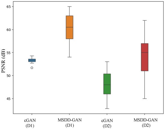 PSNR (from Equation (11)) is a measure often used to quantify image quality, where higher PSNR values indicate better accuracy and less distortion. MSDD-GAN consistently outperforms cGAN with higher PSNR values (see Figure 15). Notably, MSDD-GAN attains a median PSNR of 60.5dB, significantly higher than the cGAN value of 53.3dB. This indicates that MSDD-GAN generates thermal images with superior quality, lower reconstruction error and improve the preservation of thermal image characteristics.