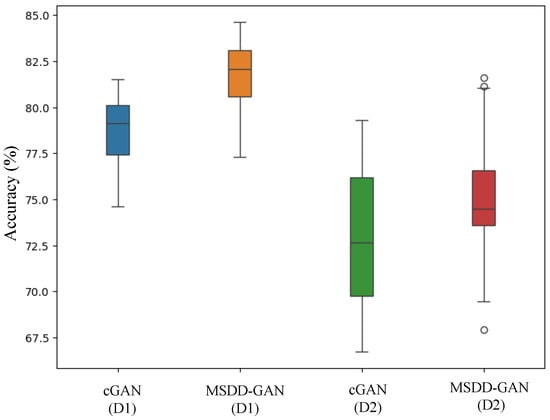 Comparison of cGAN with MSDD-GAN model using accuracy performance metric, computed with test-set of both datasets D1 and D2.